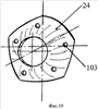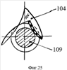Приемное винтовое приспособление 20 (фиг.18) выполнено в форме винтового усеченного конуса и образует воронкообразный винтовой вход, с помощью которого стебельчатая масса, подаваемая назад с наклонной камеры 8 в виде широкой полосы, сужается и поступает во внутренний винтовой перфорированный барабан 18 для обмолота и разделения. Торцевое отверстие приемного винтового приспособления 20 со стороны загрузки снабжено конусной съемной крышкой 24 (фиг.19). Винтовое приемное приспособление 20 крепится к внутреннему перфорированному барабану 18 фланцем 87. Внутри винтового приспособления 20 закреплены радиально по внутренним винтовым канавкам 97, 98, 99, 100, 101 пять вставок 102, которые не только обеспечивают жесткость крепление конусной крышки 24 (на чертеже не показано) к приемному винтовому приспособлению 20, но и образуют по внутреннему периметру приемного винтового приспособления 20 винтообразную крыльчатку, с помощью которой обеспечивается надежность передачи стебельчатой массы во внутреннюю полость приемного винтового приспособления 20 и далее в молотильно-сепарационный аппарат 10. Конусная съемная крышка 24 крепится винтами (на чертежах не показано) посредством отверстий 103 к вставкам 102, которые жестко, например сваркой, прикреплены внутри винтового приемного приспособления 20.