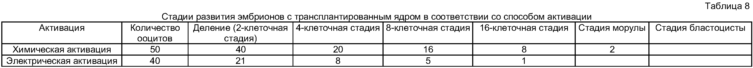 [143] В результате подтвердили, что усиление химической активации усиливает потенциал к развитию у эмбрионов с трансплантированным ядром. А именно, было показано, что в случае эмбрионов с трансплантированным ядром, активированных с помощью химического способа, 80% ооцитов достигали 2-клеточной стадии, а в случае эмбрионов с трансплантированным ядром, активированных электрическим способом, только около 53% ооцитов достигали 2-клеточной стадии. Также было обнаружено, что химически активированные эмбрионы продемонстрировали развитие эмбрионов с трансплантированным ядром до стадии морулы, а электрически активированные эмбрионы продемонстрировали развитие только до 16-клеточной стадии (Таблица 8).