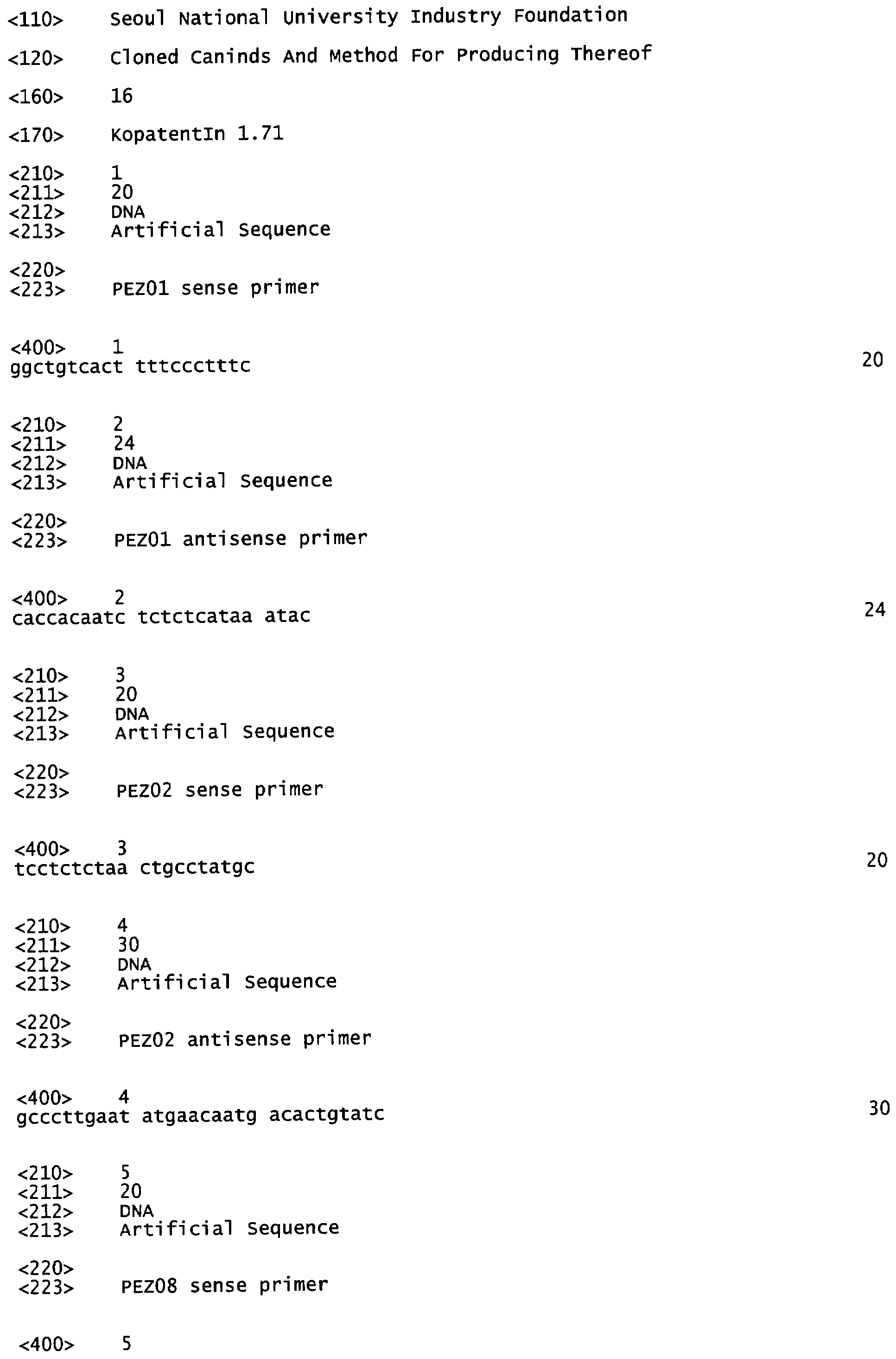 [151] Как описано выше, в настоящем изобретении предложен способ получения клонированных представителей семейства псовых. Таким образом, настоящее изобретение может внести вклад в развитие исследований в ветеринарной медицине, антропологии и медицинской науке, таких как разведение выдающихся представителей семейства псовых, сохранение редких или почти вымерших видов представителей семейства псовых, ксенотрансплантацию и модели заболеваний на животных.