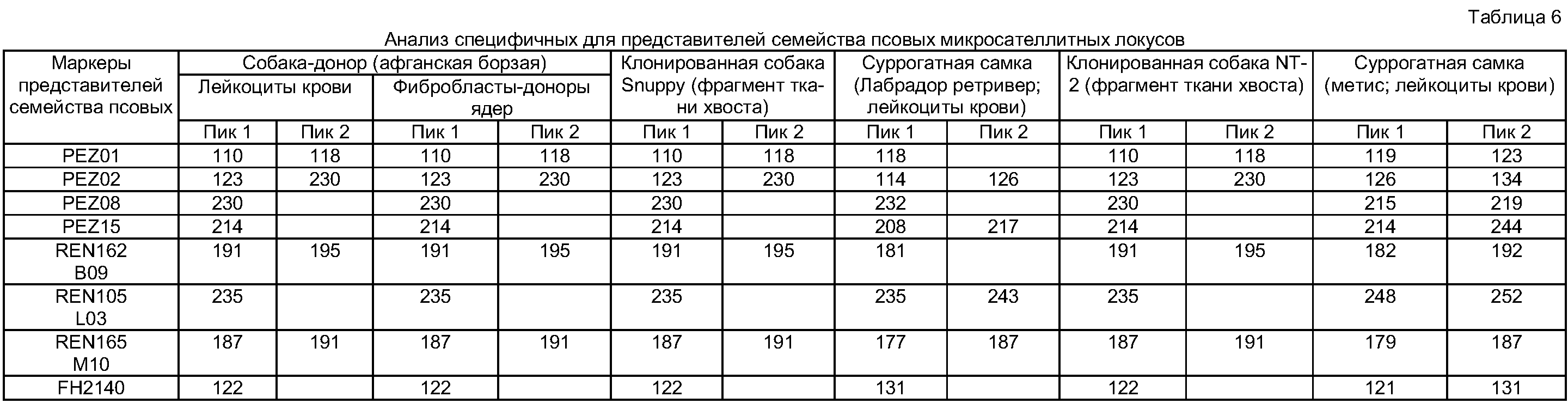 [128] В результате обнаружили, что клонированные собаки Snuppy и NT-2#, полученные в соответствии с настоящим изобретением, были полностью генетически идентичными собаке-донору афганской борзой и фибробластам, выделенным из собаки-донора. С другой стороны, клонированные собаки по настоящему изобретению и суррогатные матери (лабрадоры ретриверы и собаки смешанной породы) генетически отличались друг от друга (Таблица 6).