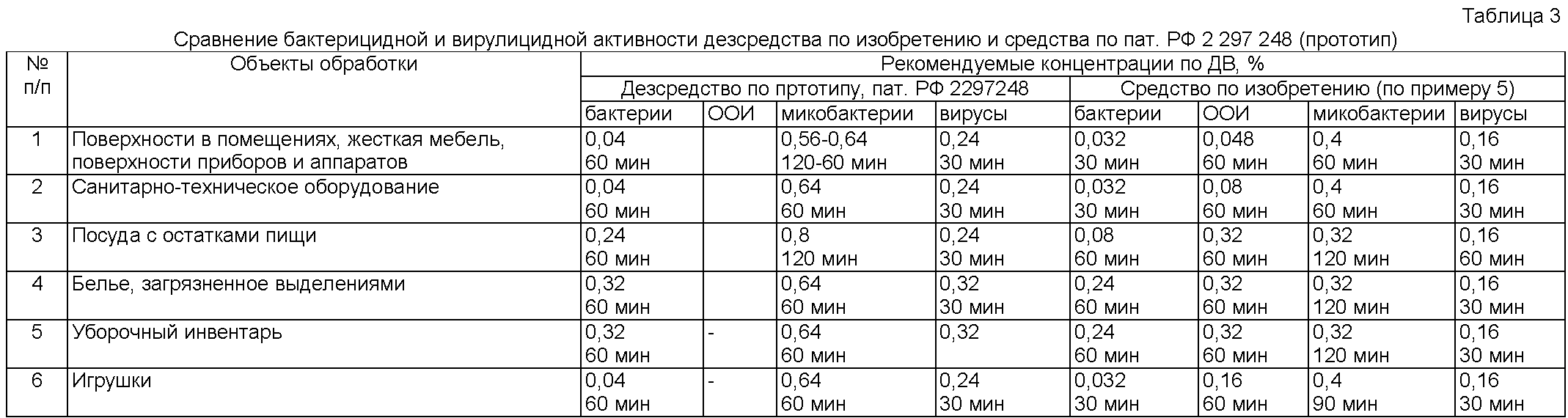 Изобретение относится к средствам для дезинфекции в лечебно-профилактических учреждениях (ЛПУ); на станциях скорой помощи, дезинфекционных станциях, в детских учреждениях, на предприятиях общественного питания, объектах коммунальной службы, на транспорте, в ветеринарии, в сельском хозяйстве, на предприятиях пищевой промышленности и в других отраслях народного хозяйства, населением в быту. Основу большей части новых разработок в области дезинфекции поверхностей, изделий медицинского назначения (ИМН), в качестве антисептиков и т.д., составляют четвертичные аммониевые соединения (ЧАС). Они обладают моющим действием, малотоксичны, не обладают выраженной коррозионной активностью, однако имеют узкий спектр антимикробного действия, так как не убивают вирусы и споры при комнатной температуре, не эффективны в отношении микобактерий туберкулеза и гепатита В. Недостатком ЧАС является также быстрое формирование устойчивости микроорганизмов к их воздействию. В последнее время на рынке дезсредств наблюдается тенденция внедрения композиционных препаратов, включающих несколько ингредиентов в качестве действующих веществ (ДВ) – ЧАС, алкиламины, производные гуанидина, альдегиды и т.д.). Использование ЧАС в комбинации с другими ДВ может привести к получению более эффективных составов. Однако иногда смешение действующих веществ может приводить к значительному снижению дезинфицирующих свойств готового средства, а введение дополнительно поверхностно-активных и других веществ с целью улучшения потребительских свойств (моющего действия, устойчивости средства в процессе использования и хранения) – к полному нивелированию дезинфицирующих свойств (Л.С.Федорова. “Научно-методические основы совершенствования и оптимизации выбора дезинфицирующих средств”. Материалы Всероссийской научной конференции, посвященной 70-летию научно-исследовательского института дезинфектологии Министерства здравоохранения Российской Федерации 22-24 октября 2003 года, с.44-46). Актуальной проблемой является подбор компонентов по количественному и качественному составу с тем, чтобы сохранить, усилить или задать необходимый спектр антимикробной активности, а также придать средству необходимые потребительские свойства. Использование новой перспективной субстанции – N,N-бис(триаминопропил)додециламина (триамина) в качестве одной из действующих компонент в смеси с ЧАС представляет интерес, так как позволяет улучшить антимикробные свойства и расширить спектр антимикробного действия композиционных дезсредств в отношении бактерий (в том числе микобактерий туберкулеза), вирусов (включая гепатиты и ВИЧ-инфекцию) и особо опасных инфекций (Федорова Л.С. Теория и практика совершенствования дезинфицирующих средств. – М.: Медицина, 2006, с.173.). Недостатком триамина является явно выраженное фиксирующее действие, что ухудшает потребительские свойства содержащих его дезинфицирующих средств и сокращает сферу их применения. Наличие фиксирующего действия при использовании дезсредства в процессе дезинфекции не позволяет совмещать в одну стадию две технологические операции – очистку от белковых загрязнений и дезинфекцию, что усложняет и удорожает весь процесс. Наиболее близким по технической сущности является дезинфицирующее средство, включающее в качестве де