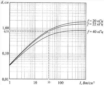 На чертеже показаны графики зависимости максимально допустимой толщины слоя фазы на поверхности излучателя от интенсивности излучаемого им ультразвука для частот 20, 22 и 40 кГц. Пунктирная линия указывает соответствующие друг другу значения функции и аргумента зависимости при частоте 22 кГц, использованные в рассмотренном примере сравнения. Каждый из приведенных графиков представляет собой верхнюю грань множества значений зависимости, удовлетворяющих признаку изобретения при указанной на нем частоте излучения ультразвука. То есть все точки фазовой плоскости «толщина – интенсивность», лежащие ниже кривой каждой из зависимостей при обозначенной на ней частоте, соответствуют изобретению.