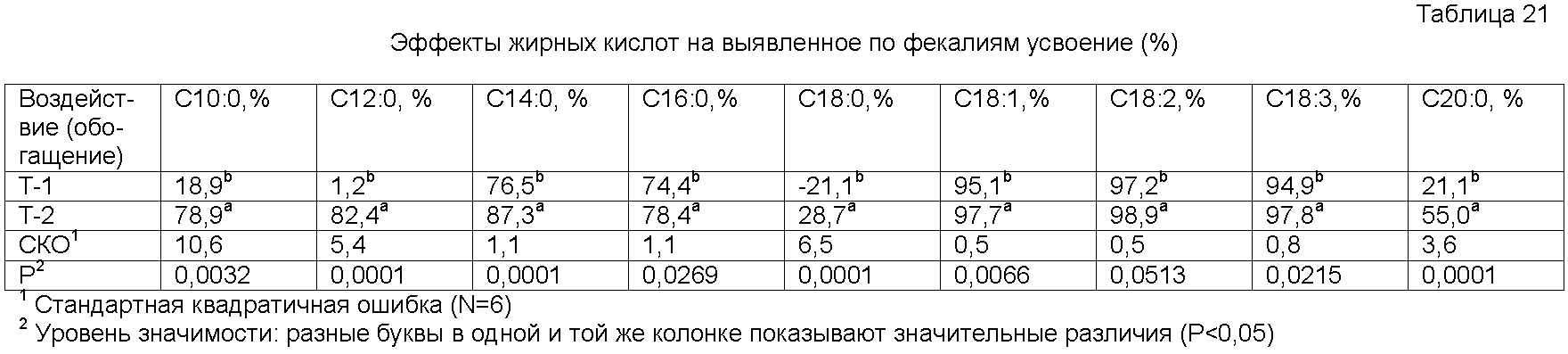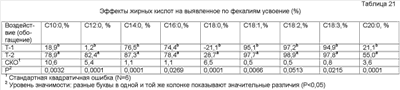 Эффекты обогащения на усвоение по фекалиям (%) жирных кислот показаны в табл.21.