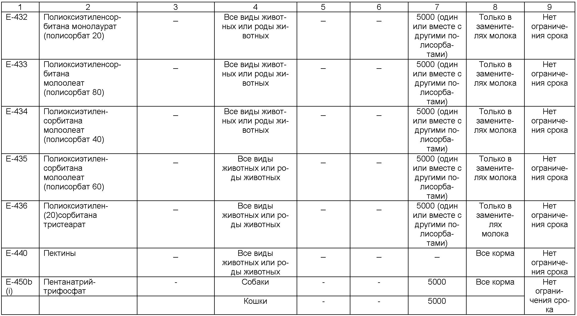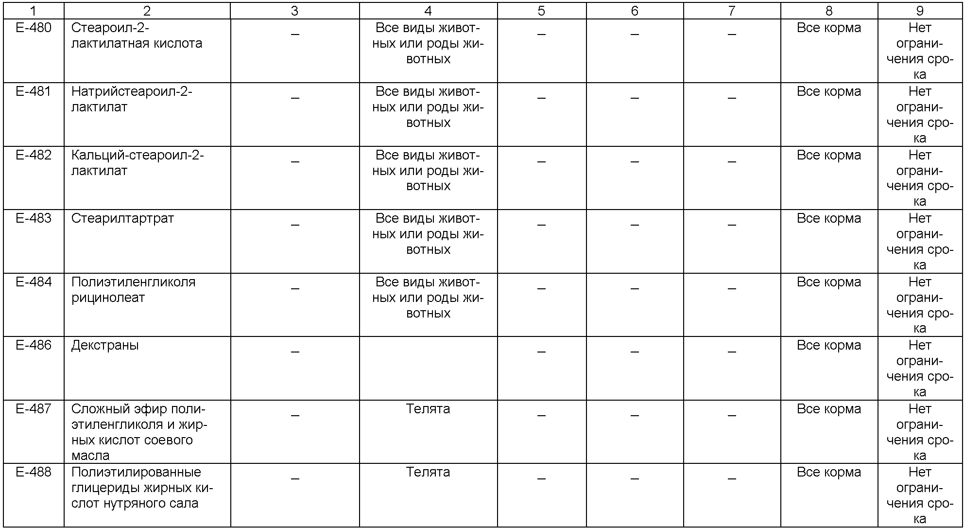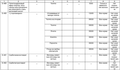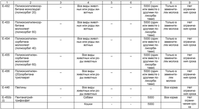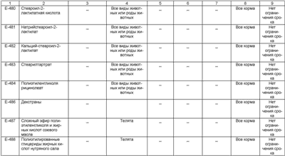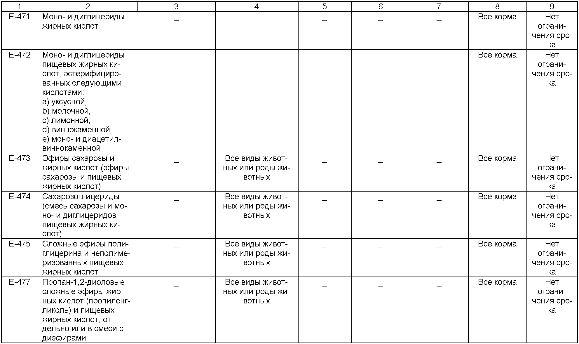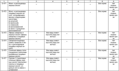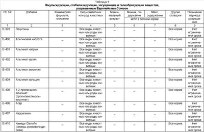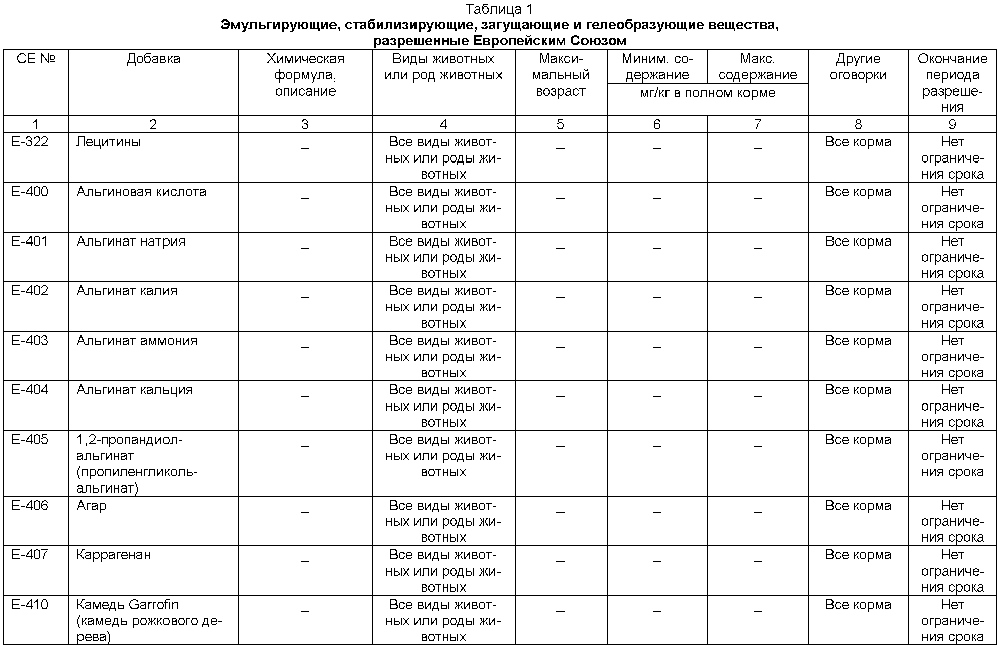 Эмульгатор может быть любым из тех, которые присутствуют в табл.1, которая представляет список эмульгаторов, разрешенных ЕЕС для использования в кормах для животных. Пропорция, в которой его нужно добавить в каждом случае, будет меняться в соответствии с критериями, которые включают их эмульгирующую способность и стоимость.