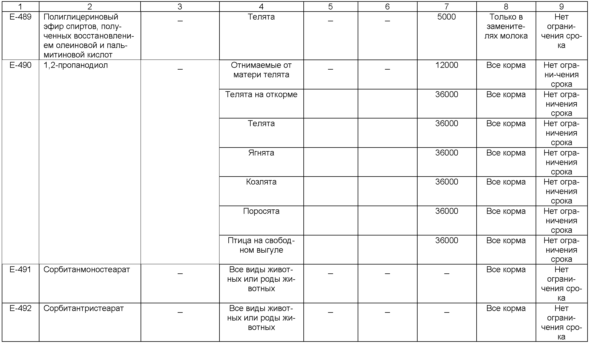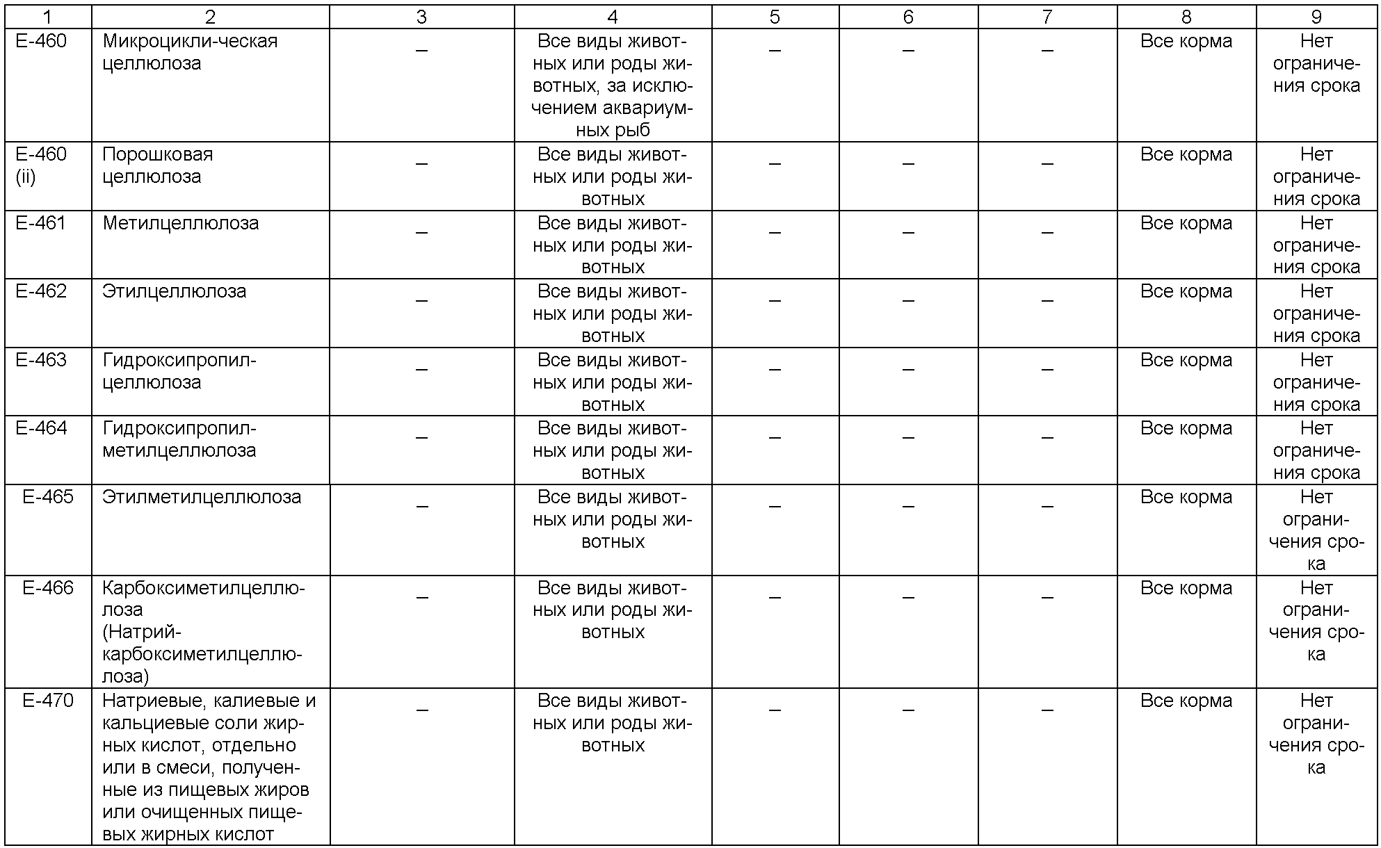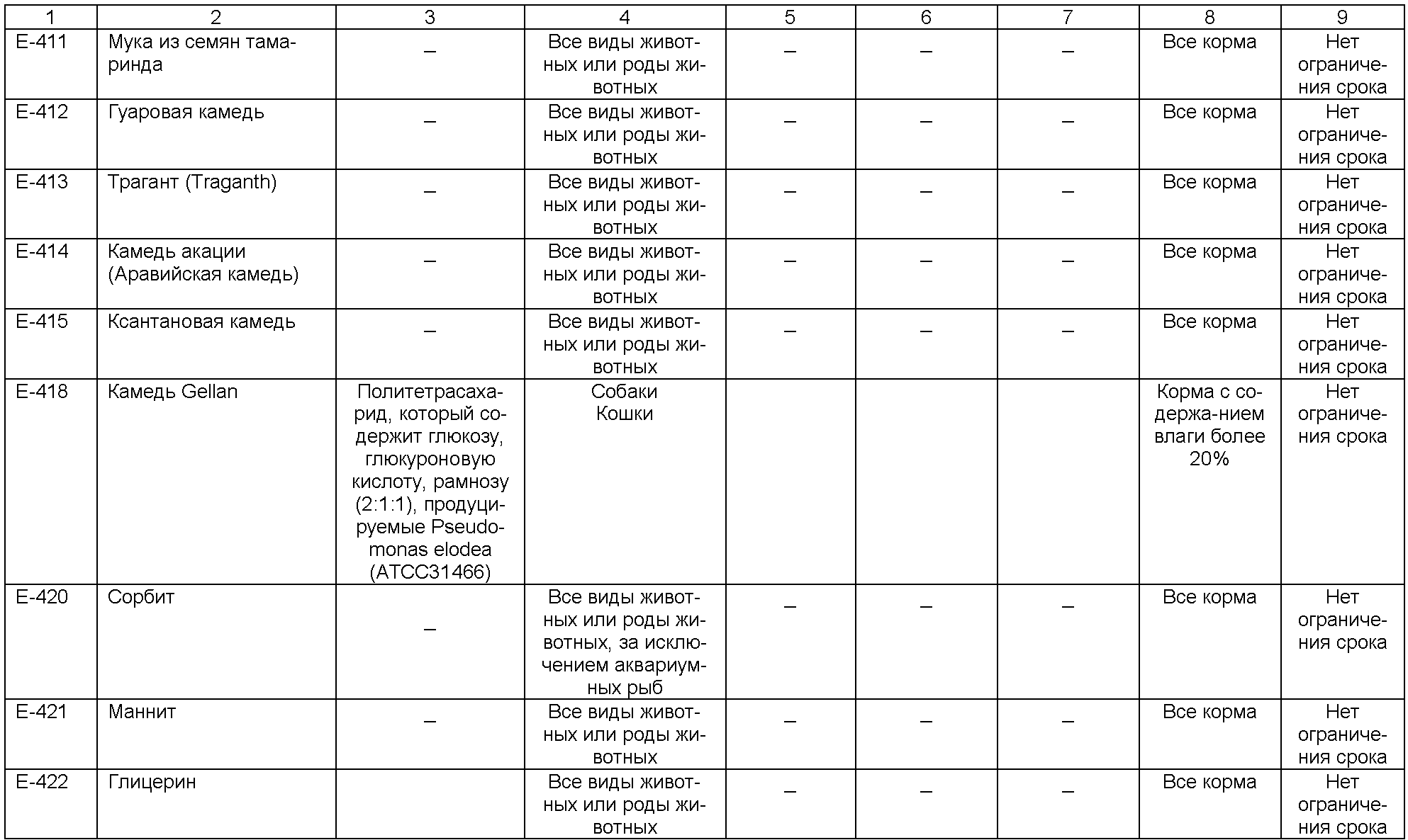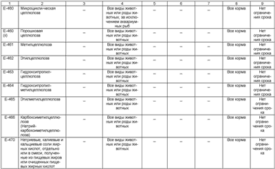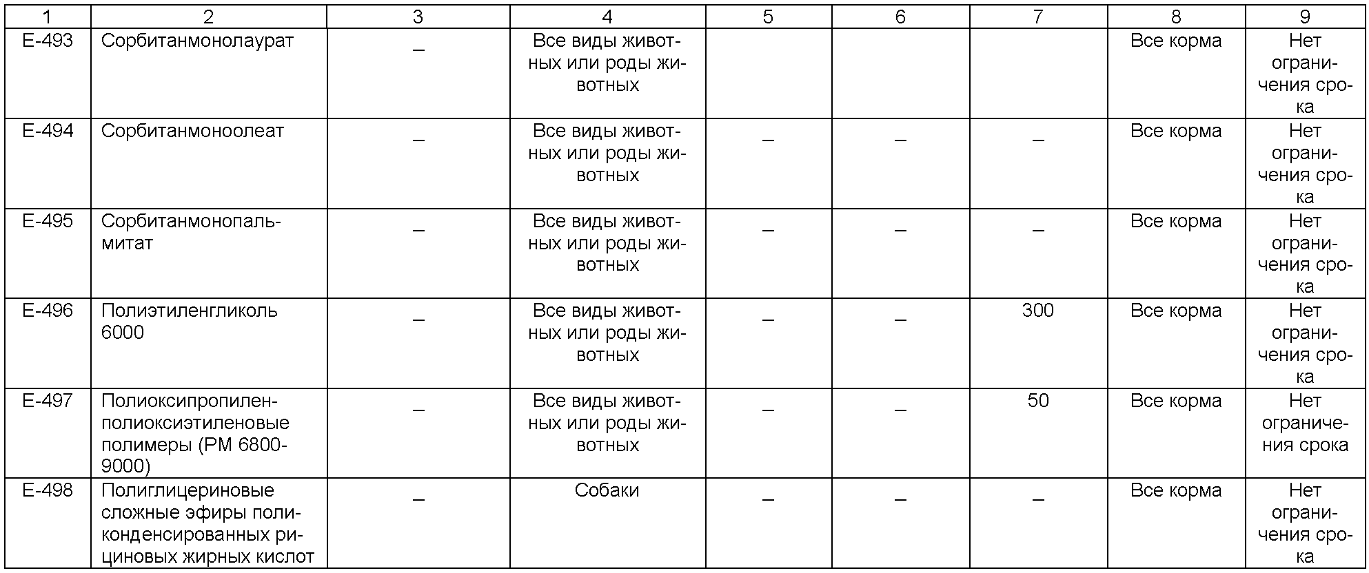 Эмульгатор может быть любым из тех, которые присутствуют в табл.1, которая представляет список эмульгаторов, разрешенных ЕЕС для использования в кормах для животных. Пропорция, в которой его нужно добавить в каждом случае, будет меняться в соответствии с критериями, которые включают их эмульгирующую способность и стоимость.