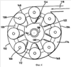 Как было упомянуто выше, циклон 130 установлен коаксиально с внешним сборником 102 мусора. Восемь циклонов 148 расположены вдоль окружности с центром по оси 164 внешнего сборника 102 мусора. Каждый циклон 148 имеет ось 166, наклоненную вниз по направлению к оси 164. Все оси 166 наклонены к оси 164 под одним углом. Кроме того, угол сужения циклона 130 больше, чем угол сужения циклонов 148, и диаметр верхнего участка 132 входного отверстия циклона 130 больше, чем диаметр цилиндрического верхнего участка 152 каждого из циклонов 148.