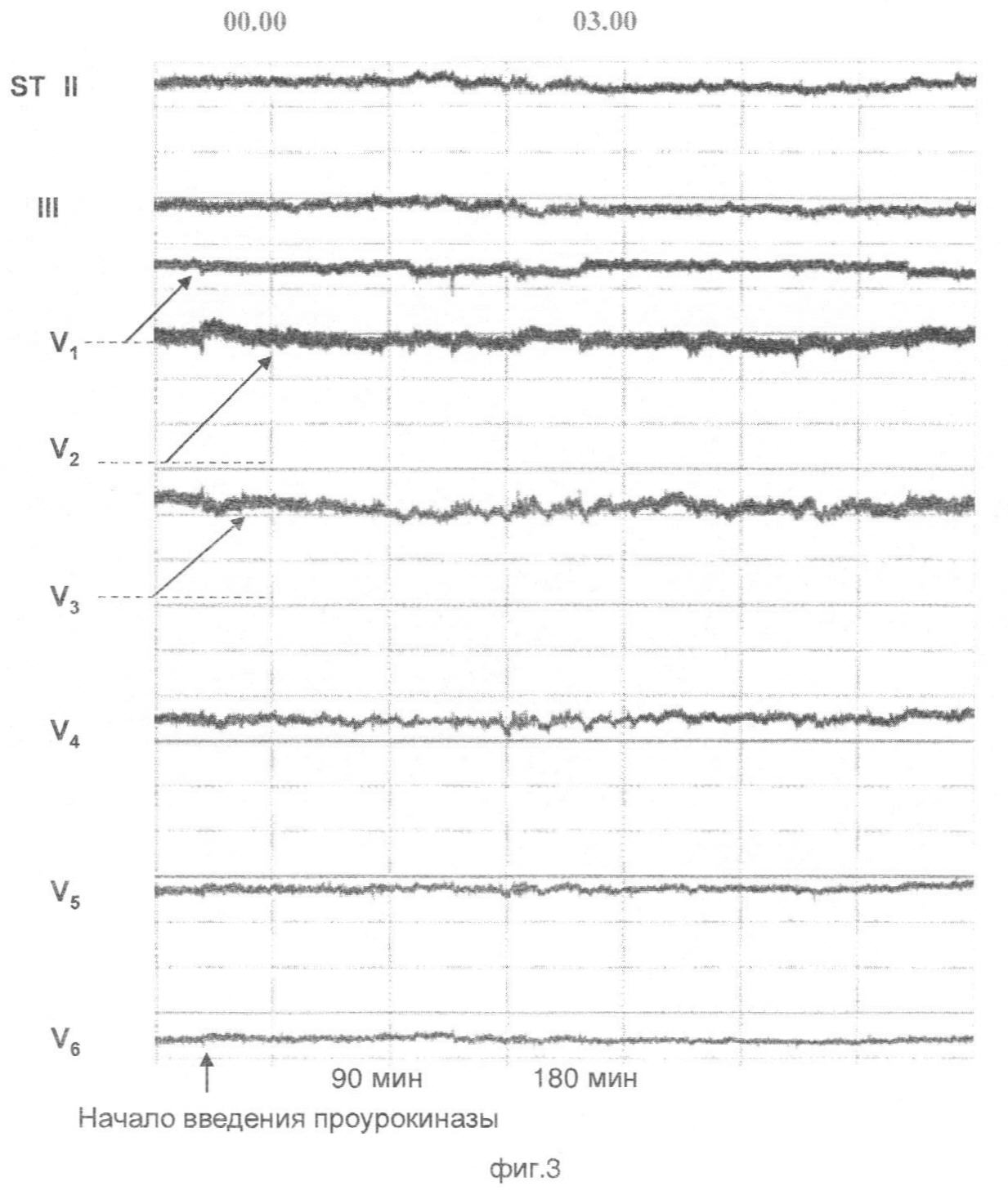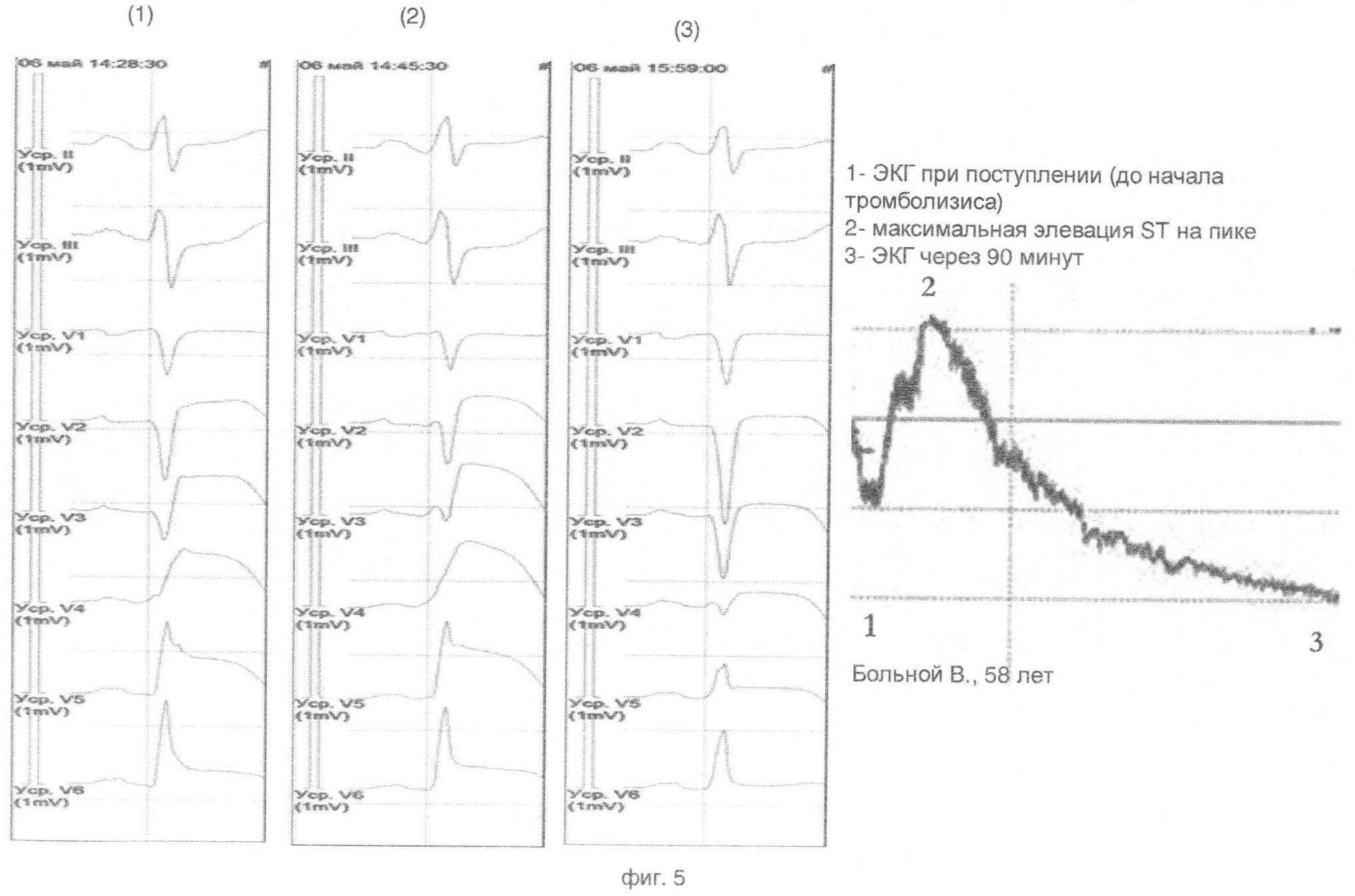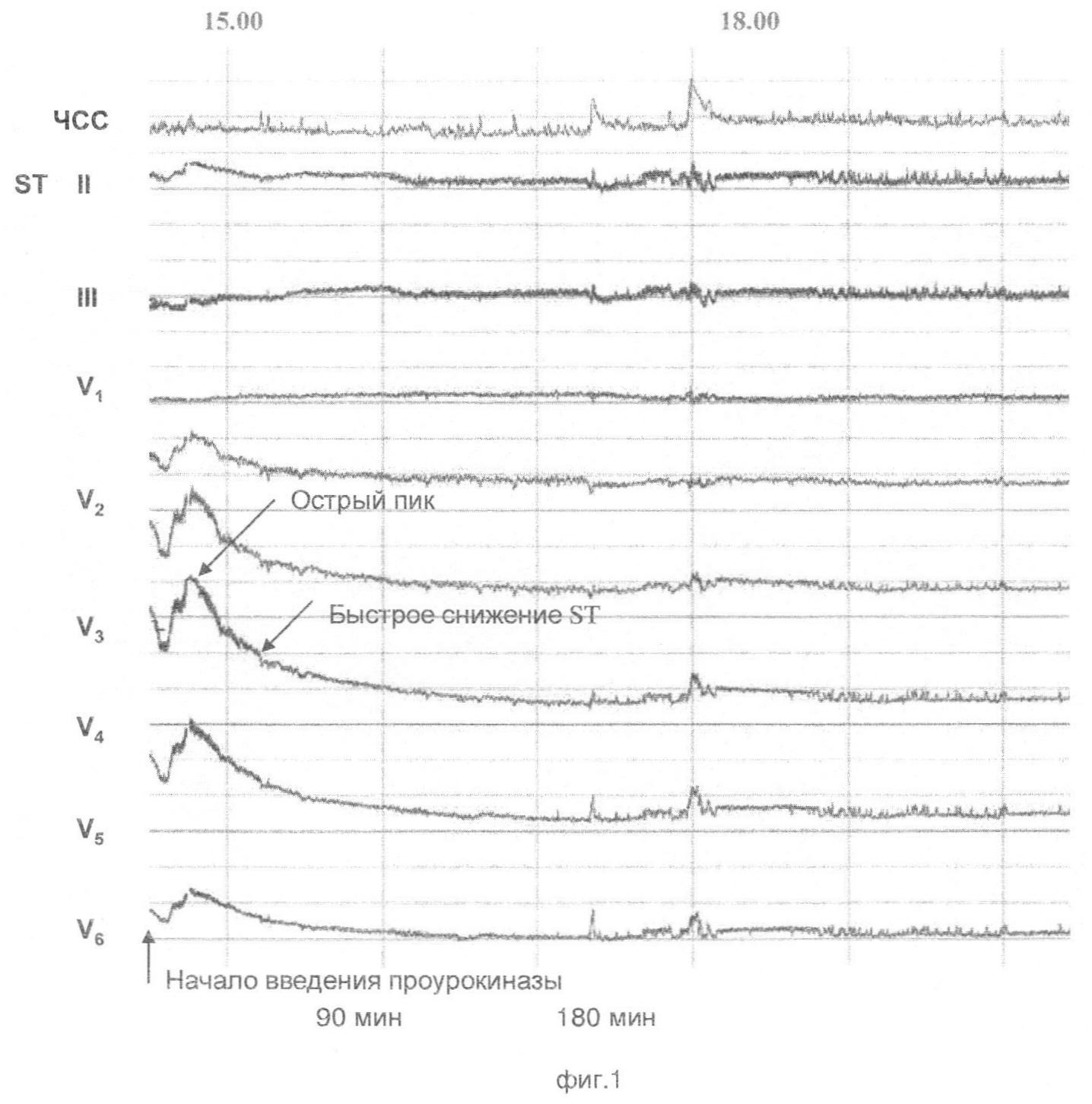 Пример типичной динамики смещения ST на фоне проведения тромболитической терапии у больных с положительным прогнозом показан на фиг.1, 2. Исходно имеет место элевация ST в отведениях V4-V6, максимальная степень в отведении V3. Вскоре после начала тромболитической терапии регистрируется острый пик увеличения элевации ST, за которым следует быстрое снижение степени элевации. Максимальная степень элевации ST составляет 140% и более от исходного. Время возрастания ST до максимальных значений не превышает 10 минут, а снижения до исходных – 15. Пик увеличения элевации ST регистрируется во всех отведениях, где исходно имела место элевация ST, однако для удобства расчетов берется отведение с максимальной степенью исходной элевации. Заключение об эффективности тромболитической терапии может быть сделано сразу по регистрации пика, за которым следует быстрое снижение ST, что в подавляющем большинстве случаев оказывается раньше, чем по истечении 60 минут.