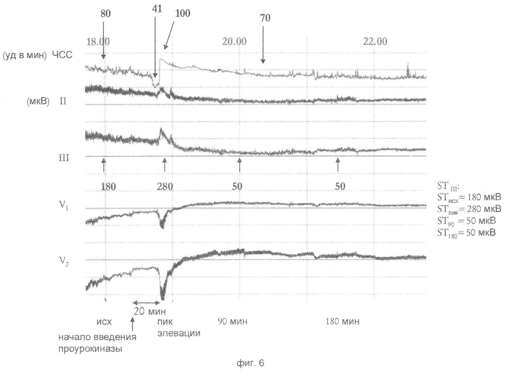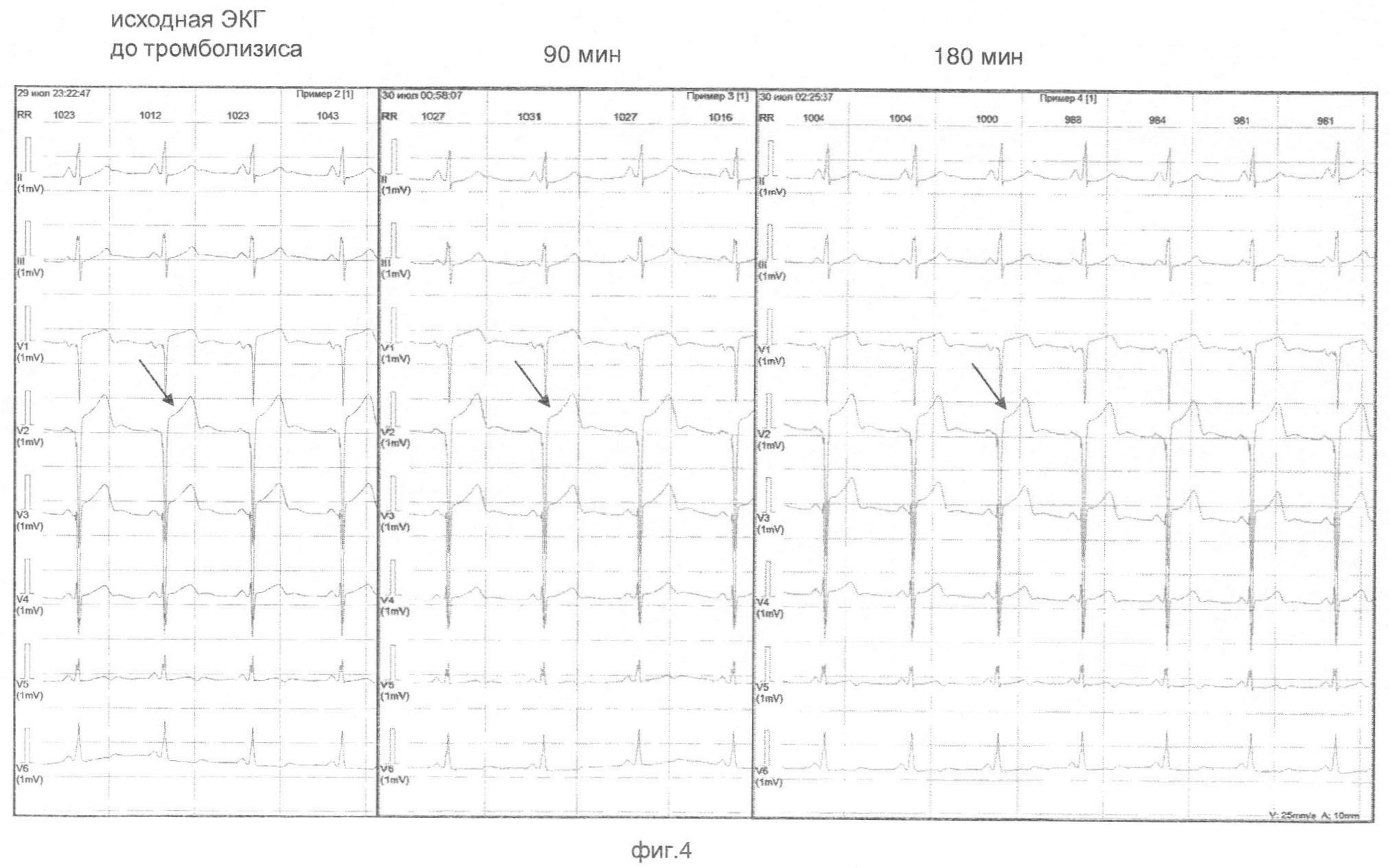 Прототипом изобретения является метод оценки эффективности тромболитической терапии на основе измерения степени снижения ST по электрокардиограмме, зарегистрированной через 90 и 180 минут после начала тромболитической терапии по сравнению с уровнем ST до ее начала. До начала реперфузионной терапии регистрируют стандартную ЭКГ в 12-отведениях, линейкой измеряют степень смещения сегмента ST относительно изолинии в каждом из отведений. Для последующего сопоставления используют отведение с максимальной элевацией ST. Начинают введение тромболитического препарата и через 90 и 180 минут после введения вновь регистрируют повторную ЭКГ. Линейкой измеряют величину элевации ST. Эффективной тромболитическая терапия признается в случае, если снижение сегмента ST составляет 50% и более от исходного уровня в отведении с максимальной элевацией ST [1, 14].