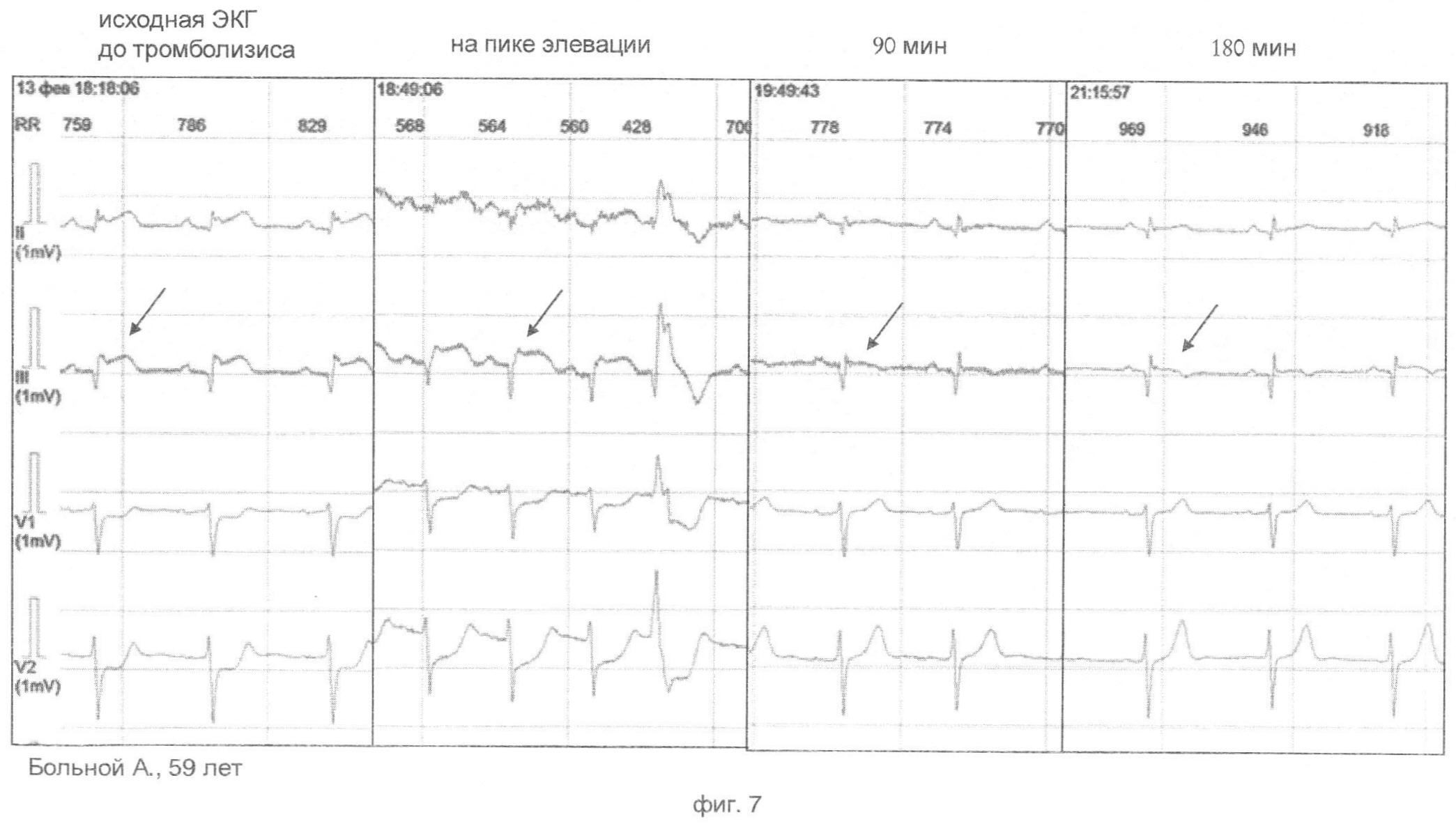 Изобретение относится к медицине, а именно к неотложной кардиологии. Регистрируют электрокардиограмму и измеряют сегмент ST. При этом электрокардиограмму мониторируют непрерывно в 12-отведениях до и в течение 60 минут после начала тромболитической терапии, одновременно непрерывно вычисляют величину смещения сегмента ST для каждого из отведений, и в случае увеличения элевации сегмента ST в отведении, где подъем был максимальным, до 140% и более от исходного значения за время, не превышающее 10 минут, и восстановления до исходного уровня не более чем за 15 минут, делают заключение об эффективности тромболитической терапии. Способ позволяет существенно сократить время, требуемое для оценки эффективности тромболитической терапии. 7 ил.