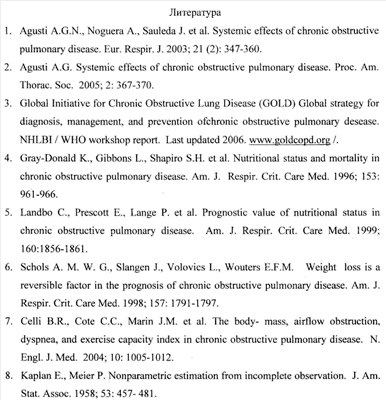 2, 2008, с.14-19. ISCHAKI E. et al. Body mass and fat-free mass indices in COPD: relation with variables expressing disease severity, Chest. 2007 Jul; 132(1): 164-9, (реферат),[он-лайн], [найдено 07.09.2009], найдено из базы данных PubMed. VESTBO J. et al. Body mass, fat-free body mass, and prognosis in patients with chronic obstructive pulmonary disease from a random population sample: findings from the Copenhagen City Heart Study, Am J Respir Crit Care Med. 2006 Jan 1; 173(1):79-83, (реферат), [он-лайн], [найдено 07.09.2009], найдено из базы данных PubMed. FAISY C. et al. Bioelectrical impedance analysis in estimating nutritional status and outcome of patients with chronic obstructive pulmonary disease and acute respiratory failure, Intensive Care Med. 2000 May; 26(5):518-25, (реферат), [он-лайн], [найдено 07.09.2009], найдено из базы данных PubMed.