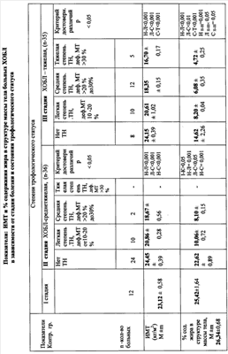 Изобретение относится к медицине: пульмонологии, общей терапии, конкретно к способу оценки степени тяжести трофологической недостаточности у больных хронической обструктивной болезнью легких (ХОБЛ). ХОБЛ характеризуется рядом экстрапульмонарных проявлений, определяющих важный системный компонент заболевания [1, 2, 3]. Трофологическая недостаточность (ТН), проявляющаяся снижением массы тела, истощением мышечной массы, жировой ткани занимает ведущую позицию в ряду системных проявлений вследствие того, что вносит не только явный вклад в развитие болезни, но и ассоциируется с риском высокой летальности [4, 5, 6]. С учетом важной роли трофологического статуса в прогнозе ХОБЛ относительно недавно предложены новые методы оценки тяжести состояния больных. В. Celli и соавт. (2004 г.) [7] разработали индекс BODE, объединяющий респираторные и системные проявления ХОБЛ, включающие в группу оценочных параметров тяжести заболевания индекс массы тела (ИМТ). Дефицит массы тела может быть обусловлен за счет любого компонента структуры тела, ведущими из которых являются жировой и белковый. Поэтому необходимы более точные количественные показатели, по которым можно определить степень дефицита структурного компонента массы тела, определяющего степень тяжести трофологической недостаточности, что позволит определить объем терапии по ее коррекции. Наиболее близким к предлагаемому является способ оценки трофологической недостаточности путем определения индекса массы тела (ИМТ), который вычисляют как отношение массы тела (в кг) к росту (в метрах), возведенному в квадрат: ИМТ=МТ/Рост2 (кг/м2). Интерпретацию значений ИМТ проводят по классификационным критериям для этого показателя Kaplan-Meier [8]. В норме ИМТ определяется в диапазоне от 20 до 24 кг/м2. О трофологической недостаточности судят при снижении показателя ИМТ ниже 20 кг/м2, при повышении значения ИМТ более 24 кг/м2 диагностируют избыточную массу тела, а показатель ИМТ свыше 29 кг/м2 означает развитие ожирения [8]. Известный способ является недостаточно информативным с клинических позиций в отношении оценки степени тяжести трофологической недостаточности, поскольку нет четко установленных критериев, характеризующих степени [7] развития этого состояния. Известный способ является также неинформативным для установления характера дефицита структурных компонентов массы тела, в частности – истощения жировой ткани у пациентов ХОБЛ, то есть ограничение области применения. Новая техническая задача – повышение точности, клинической информативности способа оценки степени тяжести трофологической недостаточности у больных хронической обструктивной болезнью легких. Поставленную задачу решают новым способом оценки степени тяжести трофологической недостаточности у больных ХОБЛ, заключающимся в определении индекса массы тела (ИМТ кг/м2), отличающимся тем, что при его значении ниже 20 кг/м2 дополнительно проводят определение процентного содержания жира в структуре массы тела методом измерения биоэлектрического импеданса в стандартных позициях между ладонными поверхностями и при значении от 25,42±1,64% до 14,62±2,26% диагностируют отсутствие трофологической недостаточности, при значении процентного содержания жира в структуре массы тела от 10,06±0,72% до 8,24% диагностируют легкую степень трофологической недостаточно