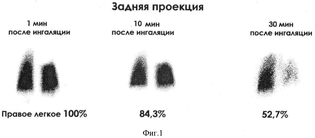 Для приготовления аэрозоля в специальную емкость ингалятора помещают радиофармпрепарат ДТПА (99mТс-Пентатех, «Диамед»), меченый 99mТехнецием в объеме 3 мл с удельной активностью 74-111 МБк/мл (555-740 МБк в 3 мл); продолжительность ингаляции составляет не более 5-7 мин при обычном для пациента ритме и глубине дыхания и подаче ингалируемой смеси под давлением 0,5-0,7 МРа; полипозиционную статическую сцинтиграфию легких начинают непосредственно после окончания ингаляции аэрозоля, регистрацию сцинтиграфических изображений проводят в задне-прямой (POST) -1-я мин после ингаляции, затем – передне-прямой (ANT) и боковых проекциях (LL 90°, RL 90°), после этого пациенту повторно проводят статическую сцинтиграфию легких в задне-прямой проекции – через 10 и 30 мин после ингаляции; запись нативных изображений осуществляют в матрицу 128×128 за интервал времени 2 мин на каждую проекцию.