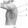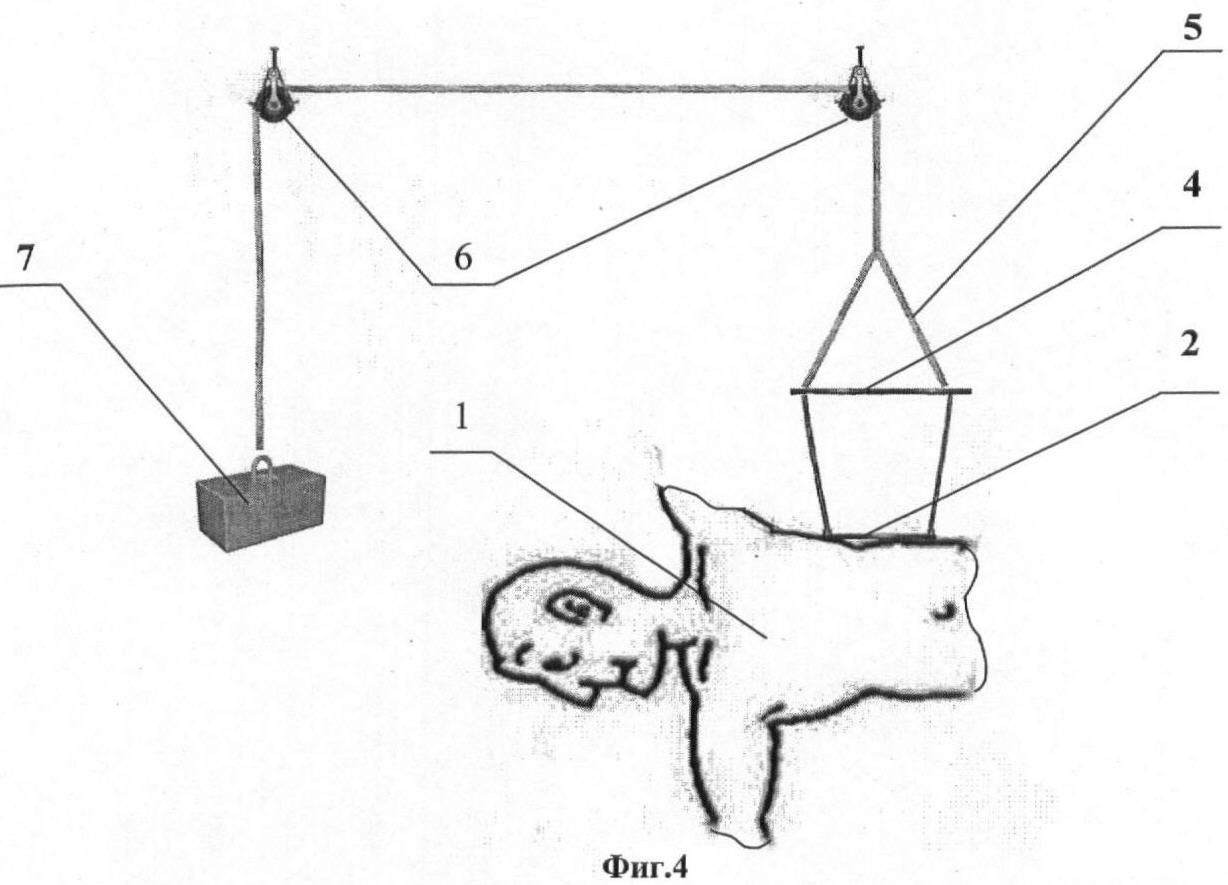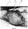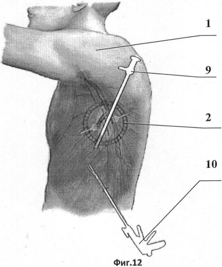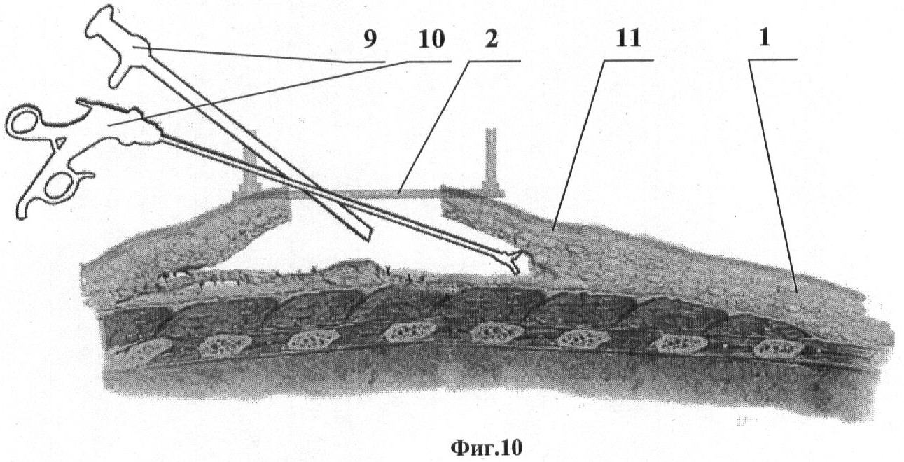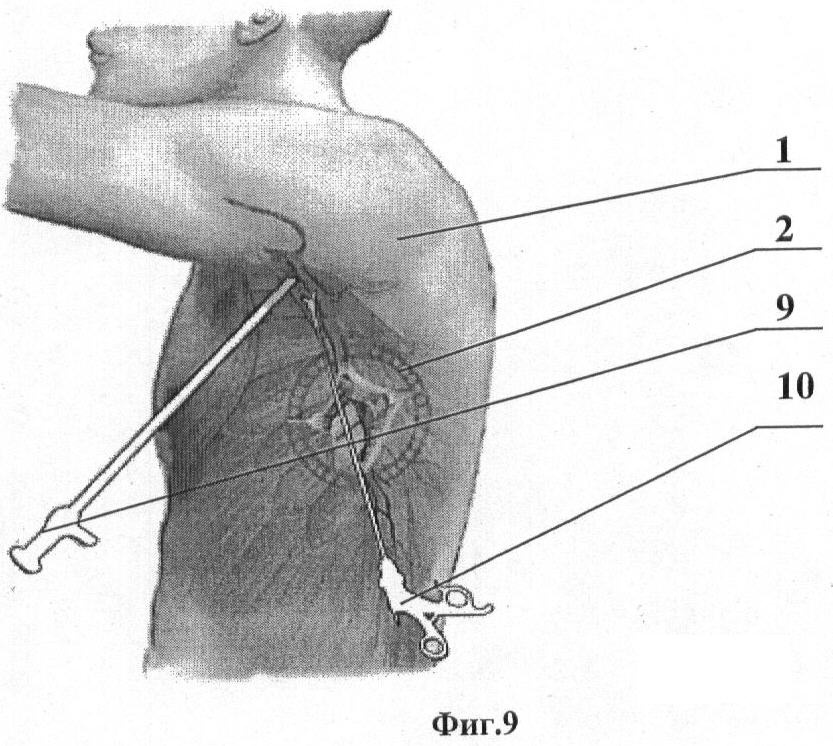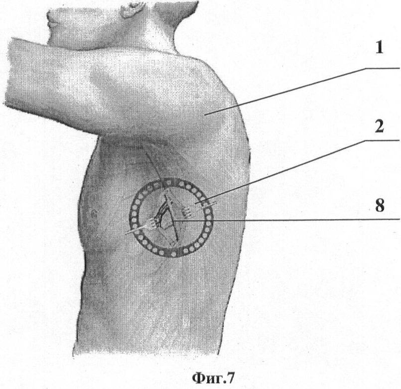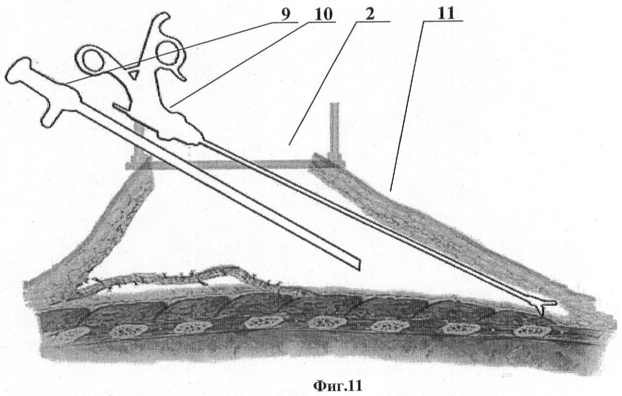 Перед выполнением указанного разреза кожи монтируют тракционную рамку 2, которая может иметь форму кольца (фиг.2) или любую криволинейную форму (фиг.3), а также может быть и разрезной. Рамку кладут на кожу таким образом, чтобы ее центр совпал с местом пересечения линии, проведенной через соски и передним краем широчайшей мышцы спины. 5-6 толстыми нитями подшивают рамку к коже и подкожно-жировой клетчатке. После этого к рамке 2 присоединяют механизм натяжения 3 с регулируемым усилием ее перемещения. Механизм натяжения в частном случае может быть выполнен в виде тросо-блочного натяжного устройства, состоящего из грузовой траверсы 4 (фиг.3), соединенной тросами 5, пропущенными через блоки 6 и связанными с набором сменных грузов 7. Затем осуществляют постепенную элевацию кожи механизмом натяжения 3 постепенным увеличением количества грузов 7 (фиг.4) при одновременном контроле сосудов эндоскопом 9 и выполнении их последовательной диссекции микроножницами 10. Выполняют разрез длиной 5-6 см в центре рамки 2 (фиг.6), в проекции места входа торакодорзальной артерии в широчайшую мышцу спины с ориентированием линии разреза вдоль переднего края широчайшей мышцы спины.