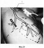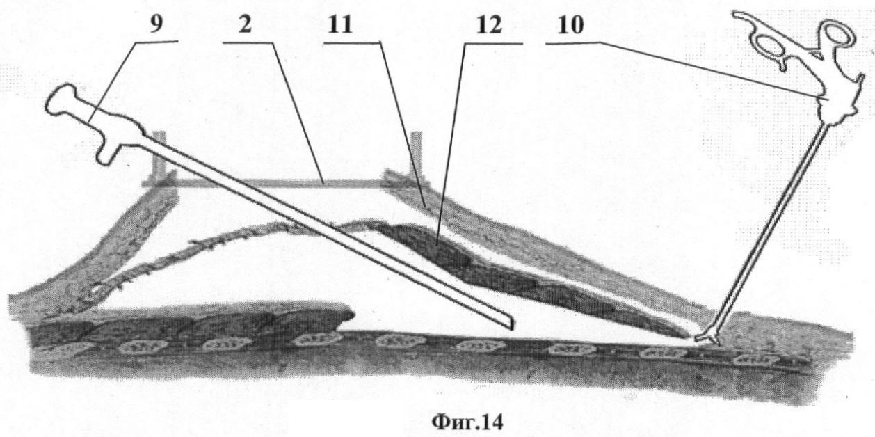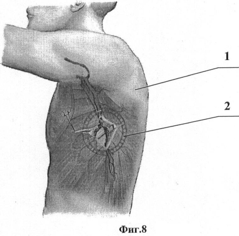 Затем рассекают кожу, подкожно-жировую клетчатку до волокон широчайшей мышцы спины, выделяют передний край широчайшей мышцы спины до краев рамки (фиг.6) и на 3-4 см далее верхнего и нижнего краев рамки 2. Выделяют торакодорзальную артерию (фиг.7, фиг.8) и ее ветви к углу лопатки и передней зубчатой мышцы. П-образно чрезкожно прошивают широчайшую мышцу спины у верхнего и нижнего краев рамки 2 и подвязывают толстыми нитями к ней. В процессе выделения регулируют натяжение кожи при одновременном эндоскопическом контроле сосудов и выполнении их последовательной диссекции.