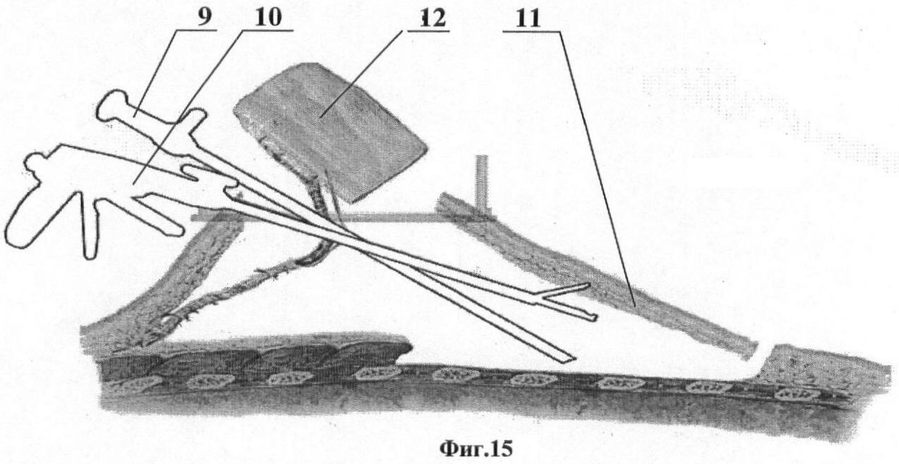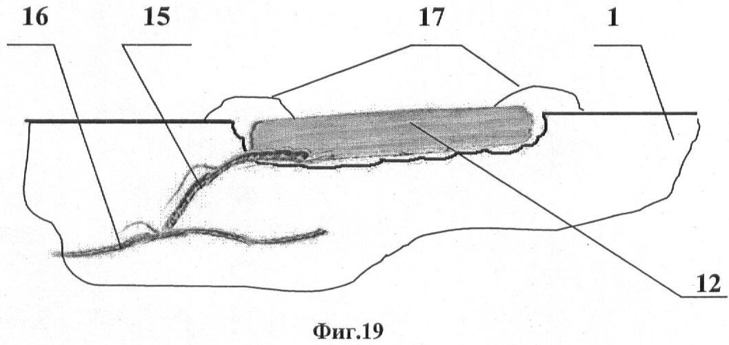 После этого перевязывают торакодорзальную артерию и коммитантные вены, после отхождения зубчатой ветви торакодорзальный нерв оставляют интактным, для этого его предварительно отделяют от сосудистой ножки (фиг.9) и отводят в сторону, входят в поверхностную фасциальную расщелину между передней зубчатой мышцей и подкожно-жировой клетчаткой. При поднятых краях кожи 11 выполняют диссекцию по поверхности передней зубчатой мышцы (фиг.10), а затем определяют нижние зубцы мышцы, васкуляризируемые ветвью торакодорзальной артерии к передней зубчатой мышце. Выполняют тупую диссекцию над каудальным краем верхнего зубца, кровоснабжаемого сосудистой ножкой. Входят в глубокую фасциальную расщелину (фиг.11) между передней зубчатой мышцей и реберной фасцией и выкраивают мышечную часть монолоскута 12 (фиг.12) по периферии, при этом внутримышечные сосудистые ветви клиппируют, для чего создают дополнительный портал (фиг.13). Осуществляют окончательную мобилизацию лоскута 12 (фиг.14) и вытягивают его через основной портал, при этом под эндоскопическим контролем пересекают сосудистую ножку на проксимальном уровне, перевязывают или клиппируют ее ветви (фиг.16), одновременно контролируют гемостаз (фиг.15) и налаживают аспирационное дренирование донорского ложа аппаратом 13 (фиг.17). Послойно ушивают основной и дополнительные порталы, после чего указанным лоскутом замещают мягкотканый дефект, соединяют его сосуды с сосудами реконструируемой части тела пациента (фиг.17). Дальнейший процесс лечения мягкотканого дефекта, например, в области пятки заключается в том, что лоскут 12 (фиг.18) транспонируют в область реконструируемого мягкотканого дефекта 14 (фиг.19), замещают им мягкотканый дефект и соединяют сосуды 15 лоскута с сосудами 16 реконструируемой области и наложением соответствующих швов 17 и укрыванием кожным трансплантантом 18.
