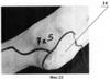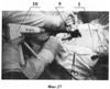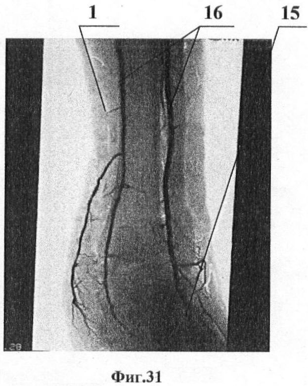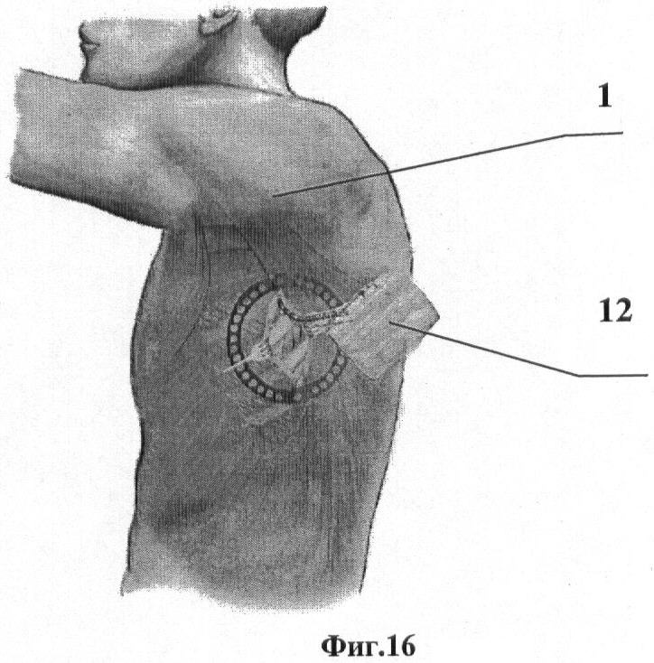 Поскольку иллюстративные материалы в отличие от описания и формулы изобретения не имеют правового значения, носят факультативный характер и представляются лишь для более ясного и четкого понимания обязательных элементов заявки (Коментарий к Гражданскому Кодексу Российской Федерации, часть четвертая, ст.1375, п.8, изд. Проспект, 2007), ход и схема выполнения оперативного вмешательства по заявленному способу представлены ниже в виде рисунков и фотографий. На рисунках показано: на фиг.1 показан доступ для эндоскопического забора лоскута передней зубчатой мышцы; на фиг.2 – рамка кольцевой формы; на фиг.3 – рамка криволинейной формы; на фиг.4. – внешний вид тракционного механизма; на фиг.5 – подвеска груза, кожа приподнята; на фиг.6 – обнажение переднего края широчайшей мышцы спины и наружной поверхности передней зубчатой мышцы; на фиг.7 – выделение первого сосуда; на фиг.8 – выделенные и идентифицированные сосуды взяты на держалки; на фиг.9 – передний край широчайшей мышцы спины приподнят, сосуды идентифицированы, проксимальная диссекция сосудистой ножки, дополнительный проксимальный портал; на фиг.10 – начало диссекции в поверхностной фасциальной расщелине; на фиг.11 – окончание диссекции в поверхностной фасциальной расщелине; на фиг.12 – выкраивание мышечной части лоскута, дополнительный дистальный портал; на фиг.13 – начало диссекции в глубокой фасциальной расщелине; на фиг.14 – окончание диссекции в глубокой фасциальной расщелине; на фиг.15 – лоскут извлечен из нативного места, гемостаз донорского ложа; на фиг.16 – лоскут готов к транспонированию, сосудистую ножку сохраняют до окончательной подготовки реципиентных сосудов; на фиг.17 – основной и дополнительные порталы ушиты, аспирационное дренирование; на фиг.18 – транспонирование и подгонка лоскута; на фиг.19 – реконструируирование мягкотканого дефекта, замещение дефекта лоскутом. На фотографиях показано: фиг.20 – раненый Г., рубцовый дефект левой пяточной области; фиг.21 – раненый Г., рентгенограммы стопы, остеомиелит пяточной кости, снижение угла Белера; фиг.22 – раненый Г., предоперационная разметка реципиентной области; фиг.23 – раненый Г., предоперационная разметка донорской области; фиг.24 – раненый Г., положение больного на операционном столе; фиг.25 – раненый Г., выделение первого сосуда через основной портал; фиг.26 – раненый Г., эндоскопическая диссекция сосудистой ножки; фиг.27 – раненый Г., выкраивание мышечной части лоскута; фиг.28 – раненый Г., лоскут передней зубчатой мышцы извлечен из нативного места; фиг.29 – раненый Г., микрососудистый шов по типу «конец-в-конец» артерии (красная стрелка) и вены (синяя стрелка); фиг.30 – раненый Г., лоскут укрыт расщепленным кожным трансплантатом; фиг.31 – раненый Г., артериограмма области реконструкции; фиг.32 – раненый Г., внешний вид области реконструкции через 1 месяц после операции; фиг.33 – раненый Г., внешний вид и функция донорской области через 6 месяцев после операции, рука поднята; фиг.34 – раненый Г., внешний вид и функция донорской области через 6 месяцев после операции, рука опущена.