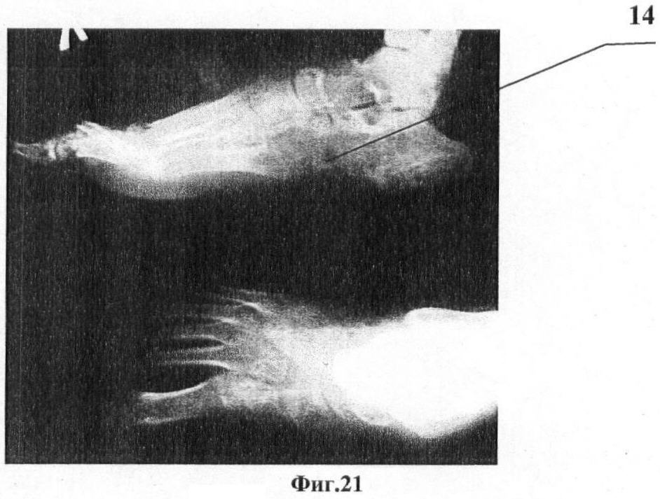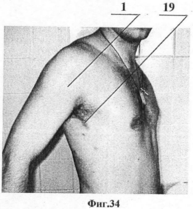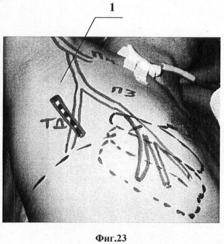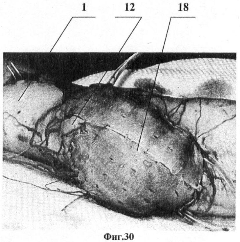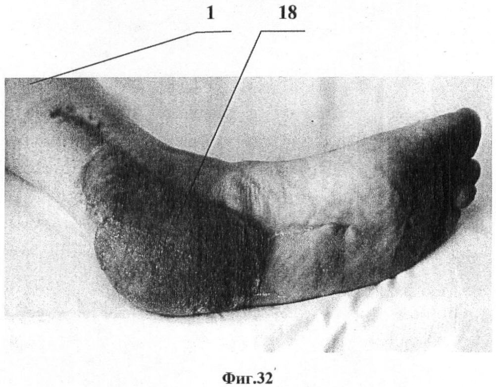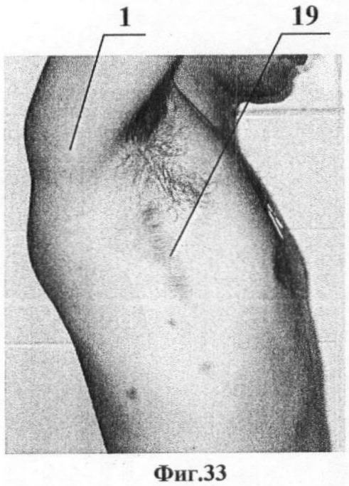 Пациент Г., получил осколочное ранение левой пяточной области во время вооруженного конфликта на Северном Кавказе в 1999 году. Раневой процесс осложнился хроническим огнестрельным остеомиелитом пяточной кости, сопряженным с мягкотканым дефектом нагружаемой поверхности пяточной области. В лечебных учреждениях выполнялась дерматотензия и пластика местными тканями. Несмотря на купированный остеомиелитический процесс и эпителизацию раны возникший рубцовый дефект размерами 7×5 см нагружаемой зоны служил причиной значительных функциональных нарушений конечности (фиг.20, фиг.21). После предоперационного планирования (фиг.22-23 в положении больного на боку (фиг.24) были иссечены рубцы и подготовлены к анастомозированию сосуды в реципиентном ложе. Далее выполнен эндоскопический забор свободного лоскута передней зубчатой мышцы (фиг.25 – фиг.38). Лоскут транспонирован в реципиентное ложе, выполнено микрососудистое анастомозирование (фиг.29), а сам лоскут покрыт расщепленным аутодермотрансплантатом 18 (фиг.30). Реконструкция лоскута была состоятельной (фиг.31, фиг.32), послеоперационный период протекал без осложнений, а морбидность донорского места 19 (фиг.33, фиг.34) оценена как низкая, а перфузия лоскута состоятельна, дефект реконструирован с удовлетворительным результатом.