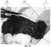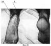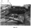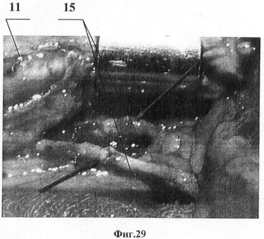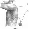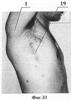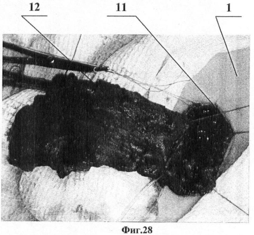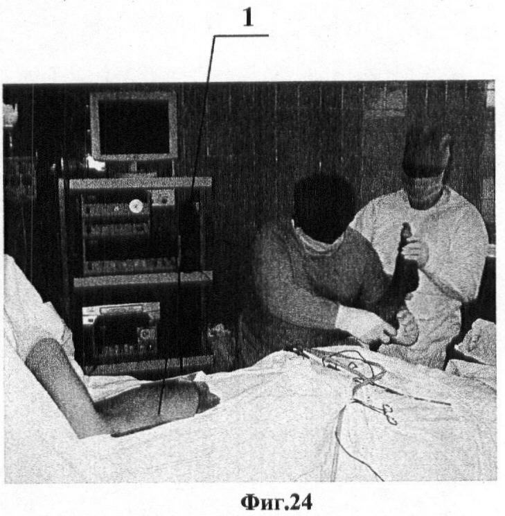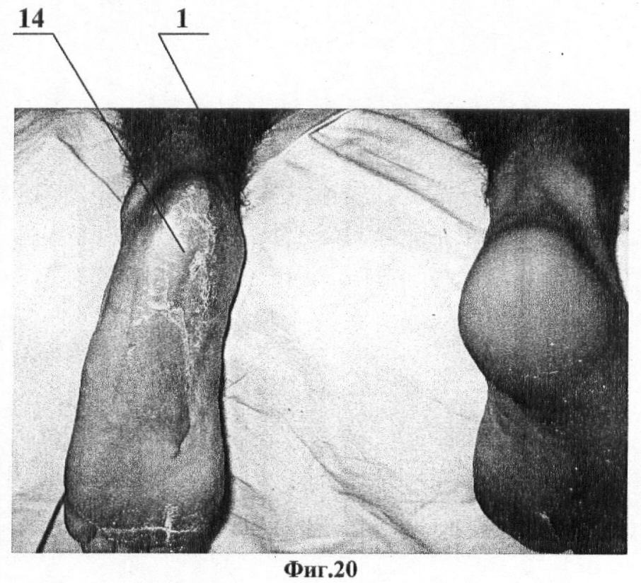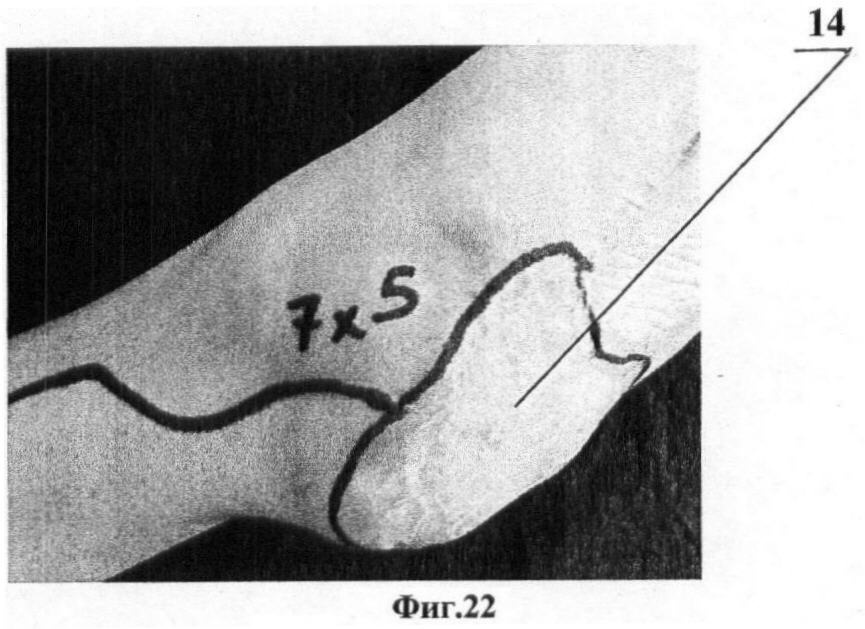 Пациент Г., получил осколочное ранение левой пяточной области во время вооруженного конфликта на Северном Кавказе в 1999 году. Раневой процесс осложнился хроническим огнестрельным остеомиелитом пяточной кости, сопряженным с мягкотканым дефектом нагружаемой поверхности пяточной области. В лечебных учреждениях выполнялась дерматотензия и пластика местными тканями. Несмотря на купированный остеомиелитический процесс и эпителизацию раны возникший рубцовый дефект размерами 7×5 см нагружаемой зоны служил причиной значительных функциональных нарушений конечности (фиг.20, фиг.21). После предоперационного планирования (фиг.22-23 в положении больного на боку (фиг.24) были иссечены рубцы и подготовлены к анастомозированию сосуды в реципиентном ложе. Далее выполнен эндоскопический забор свободного лоскута передней зубчатой мышцы (фиг.25 – фиг.38). Лоскут транспонирован в реципиентное ложе, выполнено микрососудистое анастомозирование (фиг.29), а сам лоскут покрыт расщепленным аутодермотрансплантатом 18 (фиг.30). Реконструкция лоскута была состоятельной (фиг.31, фиг.32), послеоперационный период протекал без осложнений, а морбидность донорского места 19 (фиг.33, фиг.34) оценена как низкая, а перфузия лоскута состоятельна, дефект реконструирован с удовлетворительным результатом.