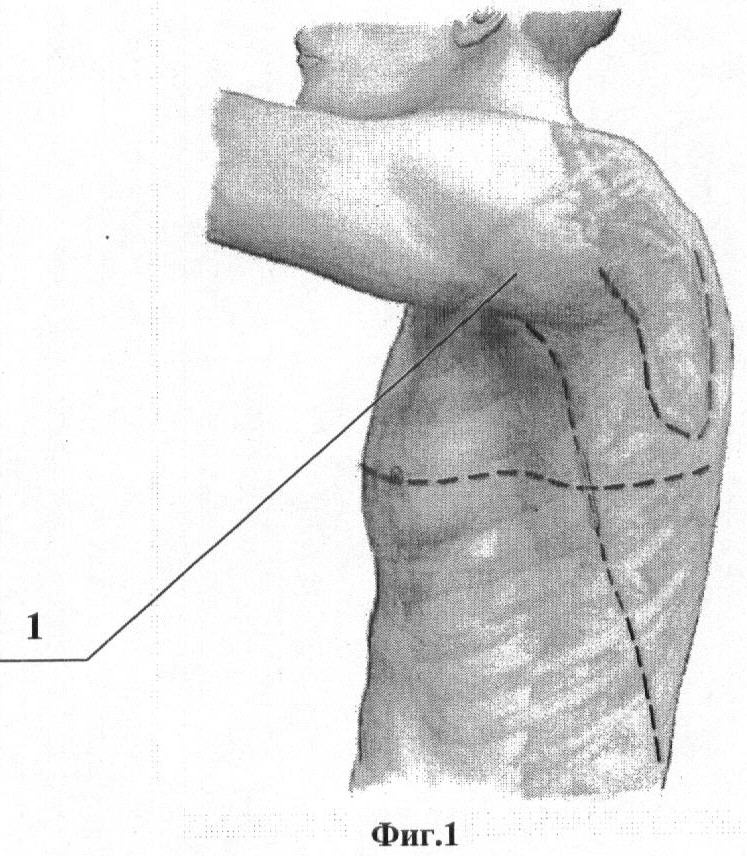 Недостатком известного способа является значительная протяженность разреза кожи и подкожно-жировой клетчатки. Для выделения лоскута передней зубчатой мышцы при известном способе необходимо выполнять разрез от вершины подмышечной впадины до проекции передней зубчатой мышцы, длина которого составляет, таким образом, 30-40 см. В результате такого протяженного разреза заживление операционной раны сопровождается значительной частотой краевых некрозов, а послеоперационный рубец является причиной нарушения функции верхней конечности и имеет неэстетический вид.