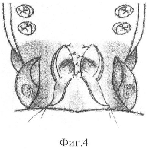 Под эндотрахеальным наркозом проводят рассечение слизисто-мышечных оболочек носоглотки и выкраивают два слизисто-мышечных лоскута на нижних ножках, проводя вертикальные полулунные разрезы медиальных стенок носоглотки (Фиг.1), слизисто-мышечные лоскуты отслаивают и откидывают (Фиг.2), раны ушивают, далее проводят два вертикальных дугообразных разреза латеральных стенок носоглотки (Фиг.3), которые образуют сквозное пространство (Фиг.4), в полученные раневые поверхности вшивают слизисто-мышечные лоскуты (Фиг.5).