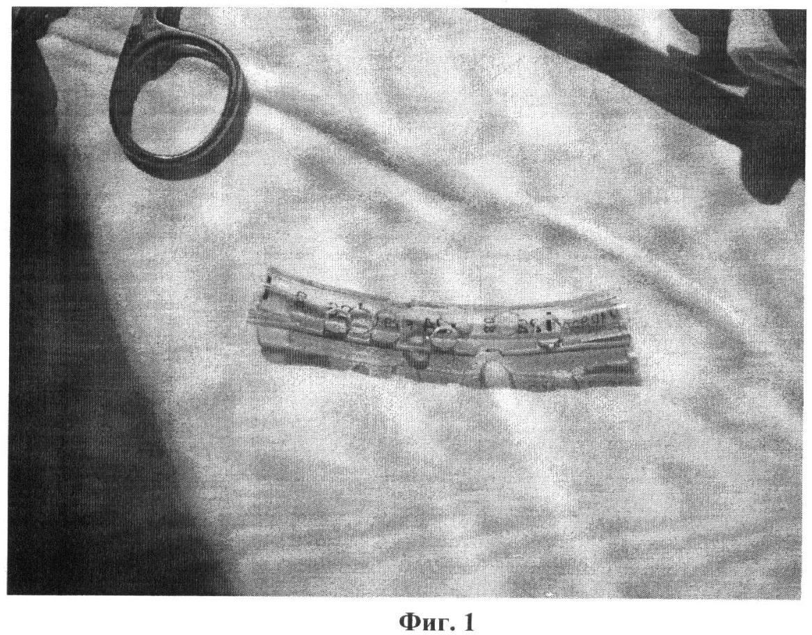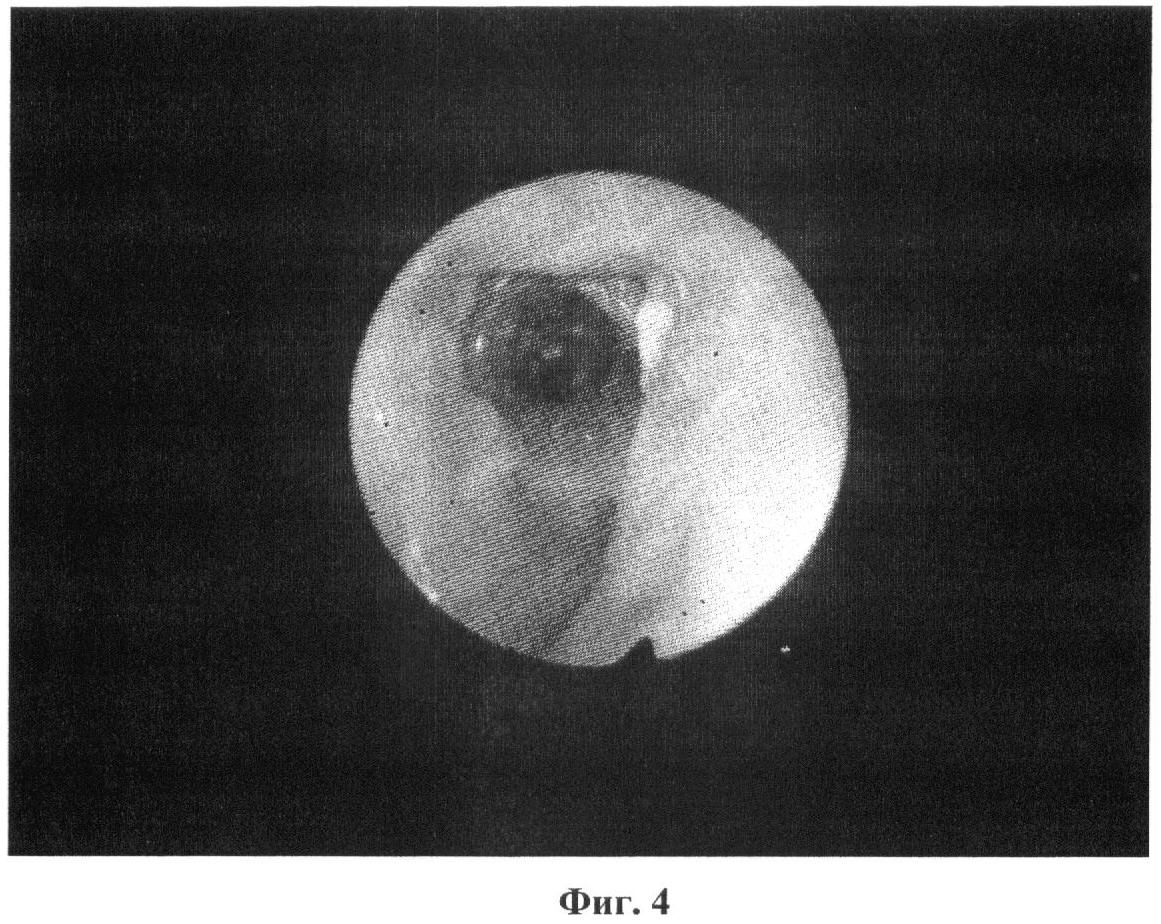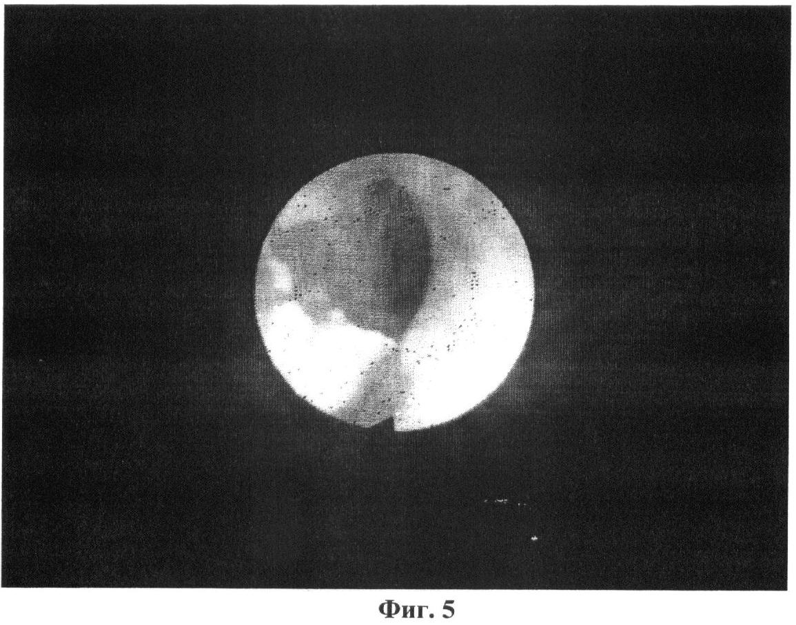 Пример 1: Пациентка К. 62 лет. После автоаварии находилась на лечении в отделении реанимации, где проводилась длительная ИВЛ. В результате стабилизации состояния была переведена в отделение травматологии и затем выписана на восстановительное лечение. По прошествии 1 месяца появилось ухудшение общего состояния, слабость, появилась одышка и стридорозное дыхание. При фибробронхоскопии: на уровне 5-го кольца имелось циркулярное сужение просвета до 0,4 см (фиг.3). Хрящевой рельеф трахеи был деформирован за счет неровной слизистой, отека и массивных наложений фибрина. В 2.0 см проксимальнее карины определялось второе сужение, форма его неправильная, просвет на этом участке до 0.7 см. Выполнено бужирование трахеи. В просвет установлен стент вышеуказанной конструкции длинной 7.0 см (фиг.4). На протяжении последующих 3-х недель выполнялись контрольные исследования (в среднем один раз в 4 дня), что позволяло оценивать состояние стента и бронхиального дерева, проводить санации. Миграции стента не выявлено. Пациентка была выписана домой в удовлетворительном состоянии. Спустя 2 месяца стент извлечен. При ФТБС: на месте расположения стента сформирован рубцовый канал до 0,9-1.0 см в диаметре (фиг.5), кашлевой рефлекс удовлетворительный, картина острая, по центру, в ТБД скудный слизистый секрет. Устья бронхов правильной формы, проходимы. Слизистая розовая. Дыхание пациентки свободное, состояние удовлетворительное.