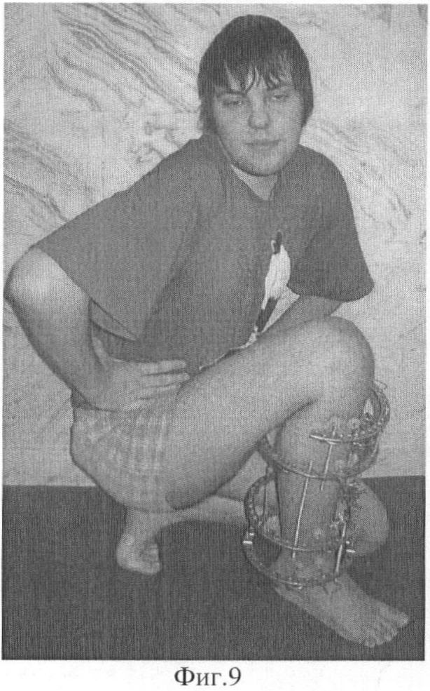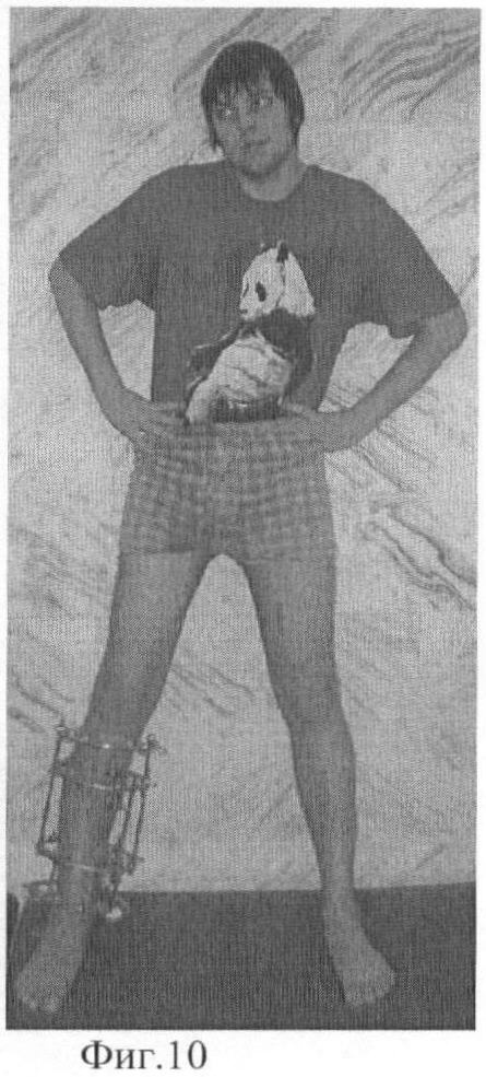 Демонстрируем сказанное клиническим наблюдением. Больной С-ов, 18 лет, история болезни 12608/2008. В результате ДТП получил оскольчатый перелом средней трети обеих костей правой голени со смещением фрагментов (Фиг.5 и 6). Выполнен чрескостный остеосинтез аппаратом внешней фиксации. Вначале были проведены базовые чрескостные элементы и смонтирована рама аппарата (Фиг.1). Затем смещение фрагментов было устранено с помощью стержней-шурупов (Фиг.2). При этом возникли деформация и напряжение базовых чрескостных элементов. Были введены стабилизирующие стержни-шурупы (Фиг.3). После этого, не опасаясь вторичного смещения фрагментов, базовые чрескостные элементы были переустановлены (Фиг.7 и 8). Период фиксации составил 103 дня. Осложнений (вторичного смещения фрагментов, воспаления мягких тканей в области выхода чрескостных элементов) отмечено не было (Фиг.9 и 10). Через неделю после снятия аппарата внешней фиксации (Фиг.11-14) больной приступил к труду.