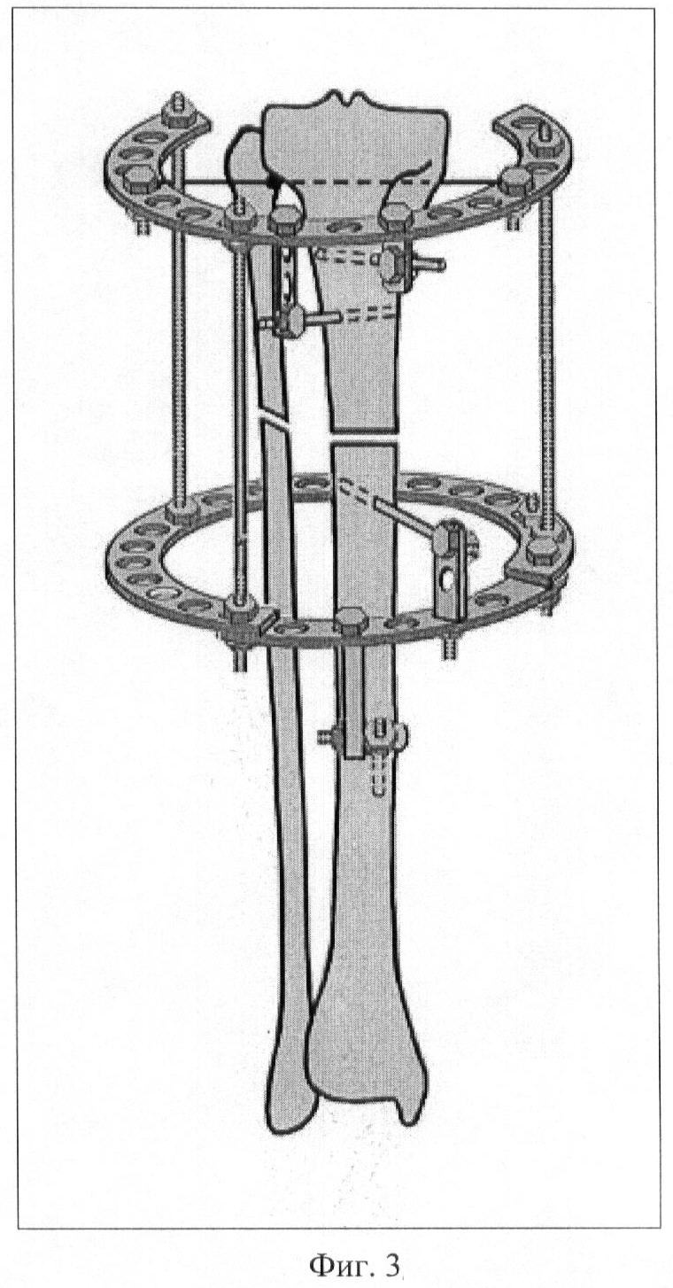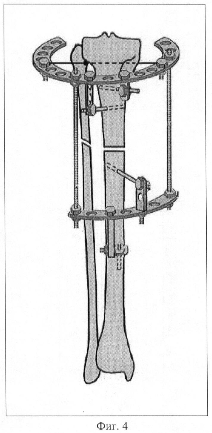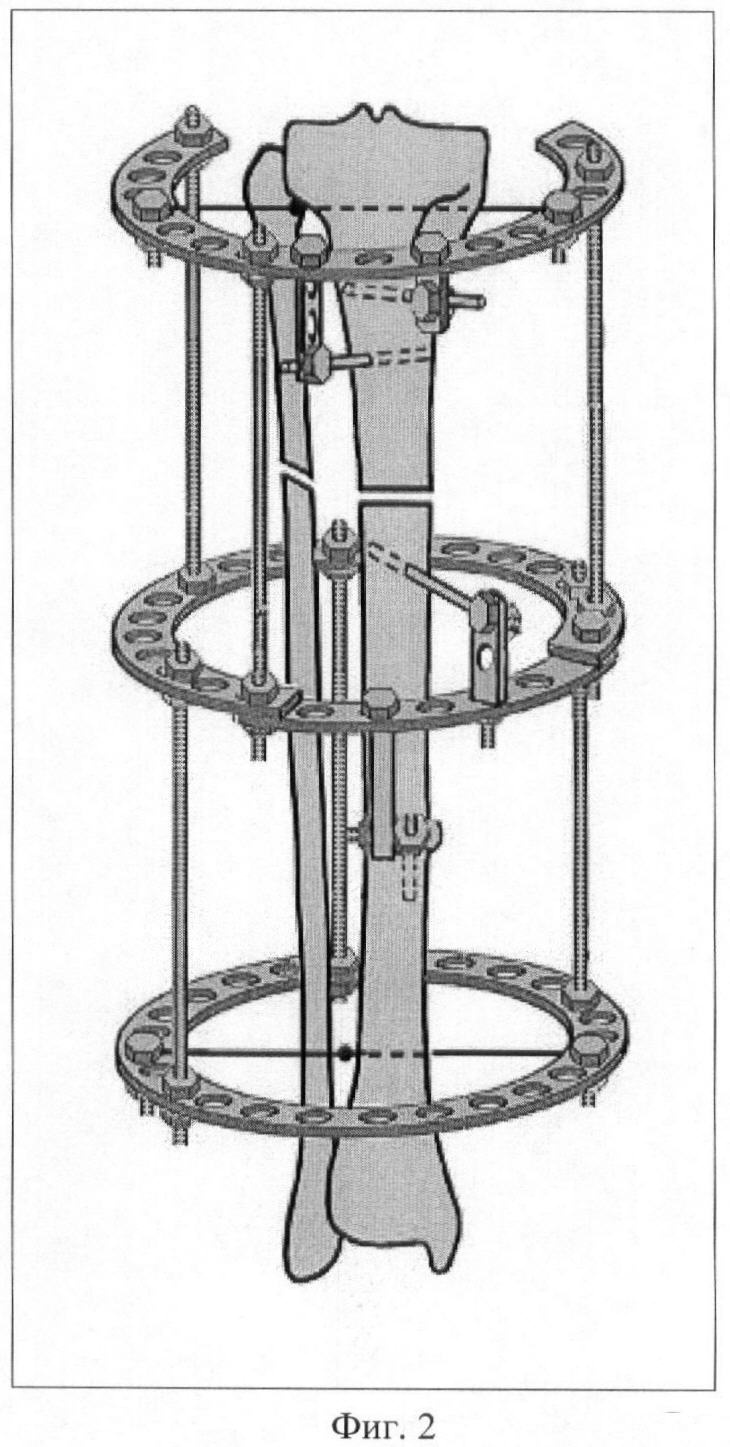 Наиболее близким к предлагаемому изобретению является способ комбинированного («спице-стержневого») чрескостного остеосинтеза переломов большеберцовой кости [Мыкало, Д.А. Комбинированный чрескостный остеосинтез при переломах костей голени и их последствиях: автореф. дис. канд. мед. наук / Мыкало Д.А. – СПб., 2008. – 25 с.] (фиг.2), согласно которому через проксимальный метаэпифиз большеберцовой кости проводят базовую спицу с упорной площадкой во фронтальной плоскости. На уровне дистального метаэпифиза проводят вторую базовую спицу с упорной площадкой через обе кости голени. Монтируют аппарат из трех или четырех опор. При этом проксимальная опора представляет собой 2/3 или 3/4 кольцевой, а промежуточные составлены из секторов – 2/3 и 1/3 кольцевой опоры. Прилагают дистракцию, вводят парафрактурные чрескостные элементы – стержни-шурупы и выполняют репозицию.