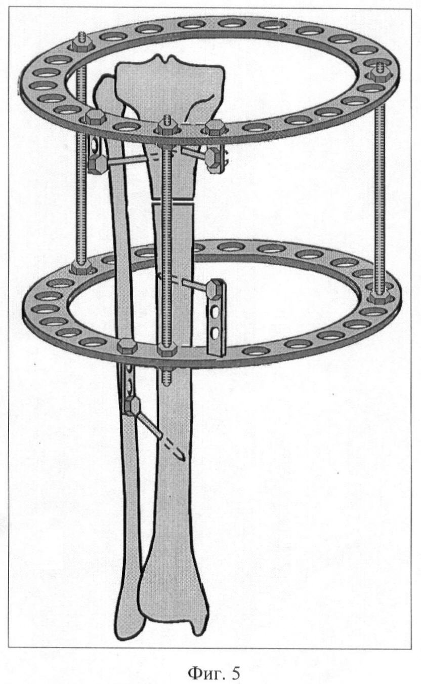 Фиг.5 – схема чрескостного остеосинтеза костей голени согласно предлагаемого способа (полная компоновка).