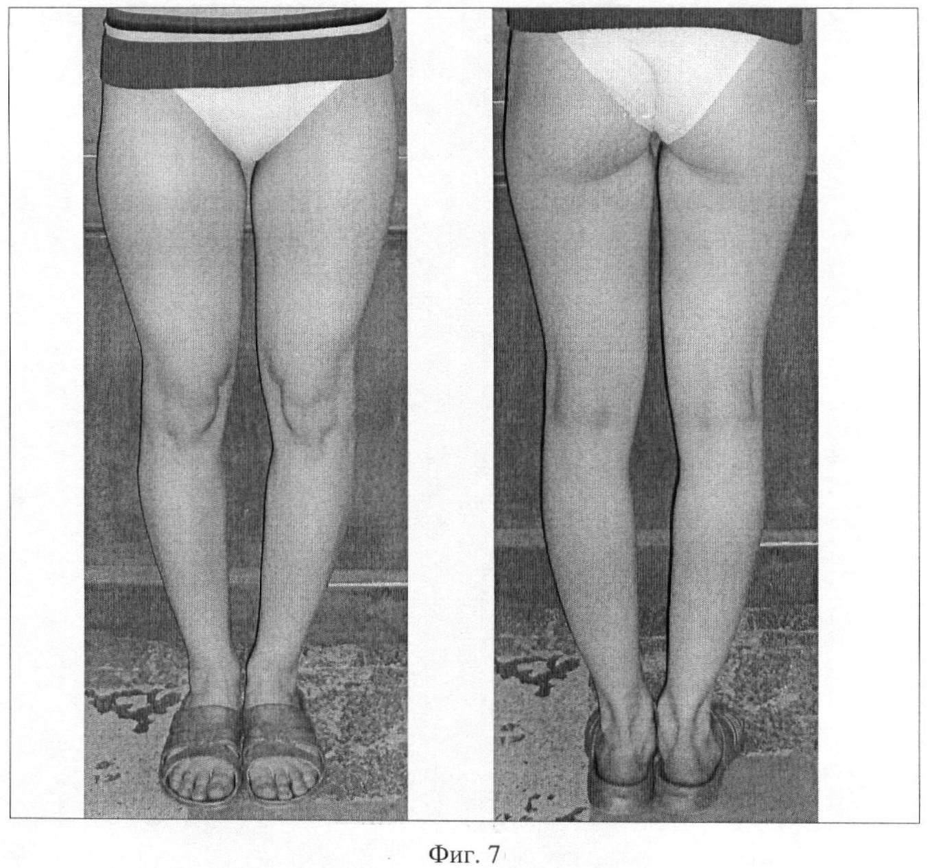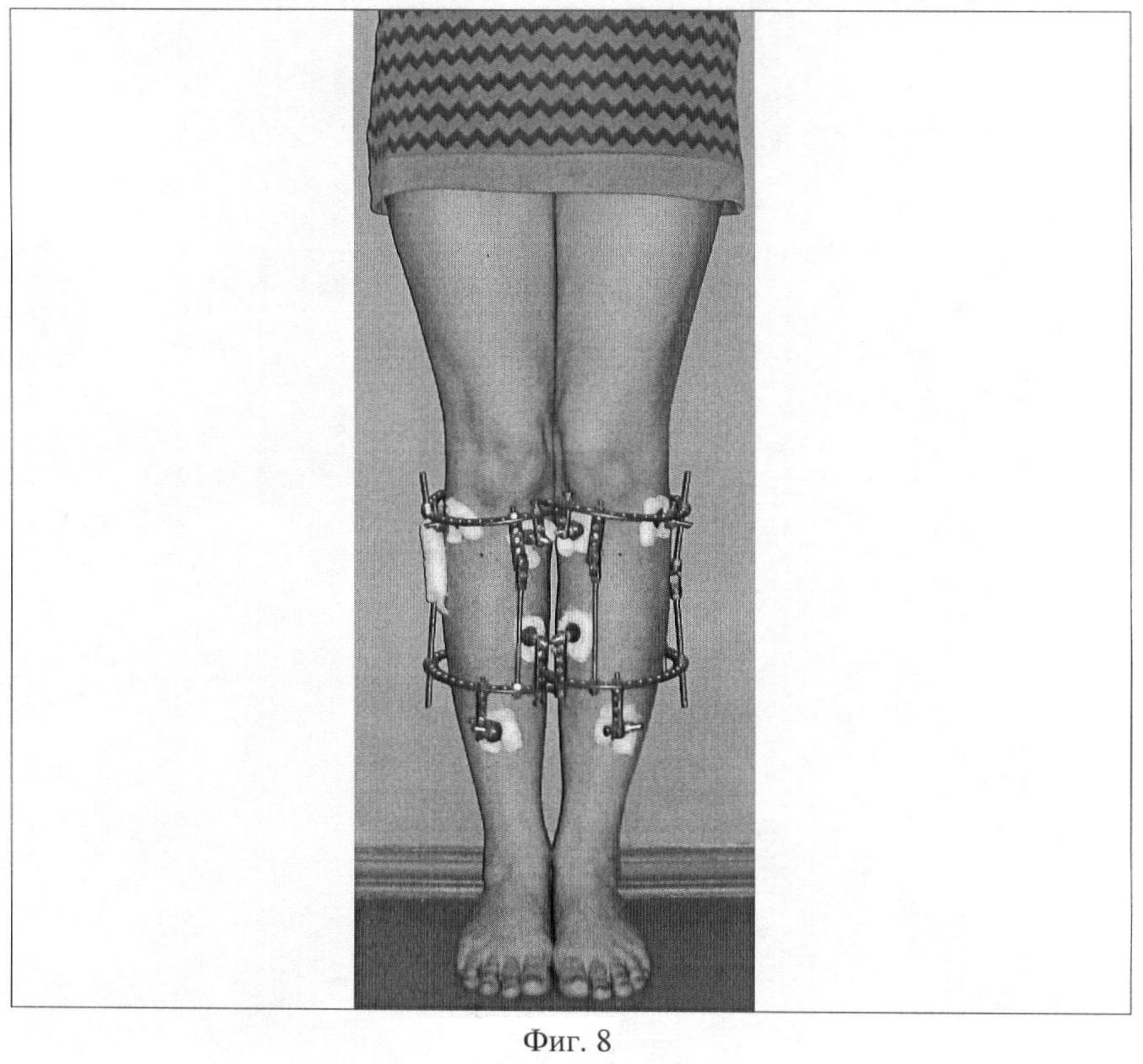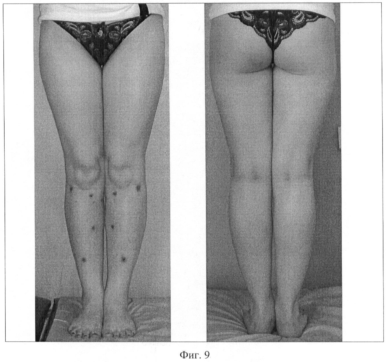 Клинический пример. Пациентка С., 32 лет, поступила в РНИИТО им. Р.Р.Вредена по поводу двусторонней варусной деформации обеих голеней (фиг.7). 08.05.2008 г. выполнена операции остеотомии обеих большеберцовых костей в верхней трети, наложение аппаратов внешней фиксации на обе голени согласно предлагаемого способа. Деформации обеих голеней были устранены в течение 2-х дней при помощи шарниров. Окончательная «остаточная» коррекция была выполненная после демонтажа внутренних частей обеих опор, что позволило пациентке свести ноги до их соприкосновения (фиг.8). Кроме этого подобная модульная трансформация аппарата позволила больной более комфортно ходить. Аппарат демонтирован через 3 месяца (фиг.9).