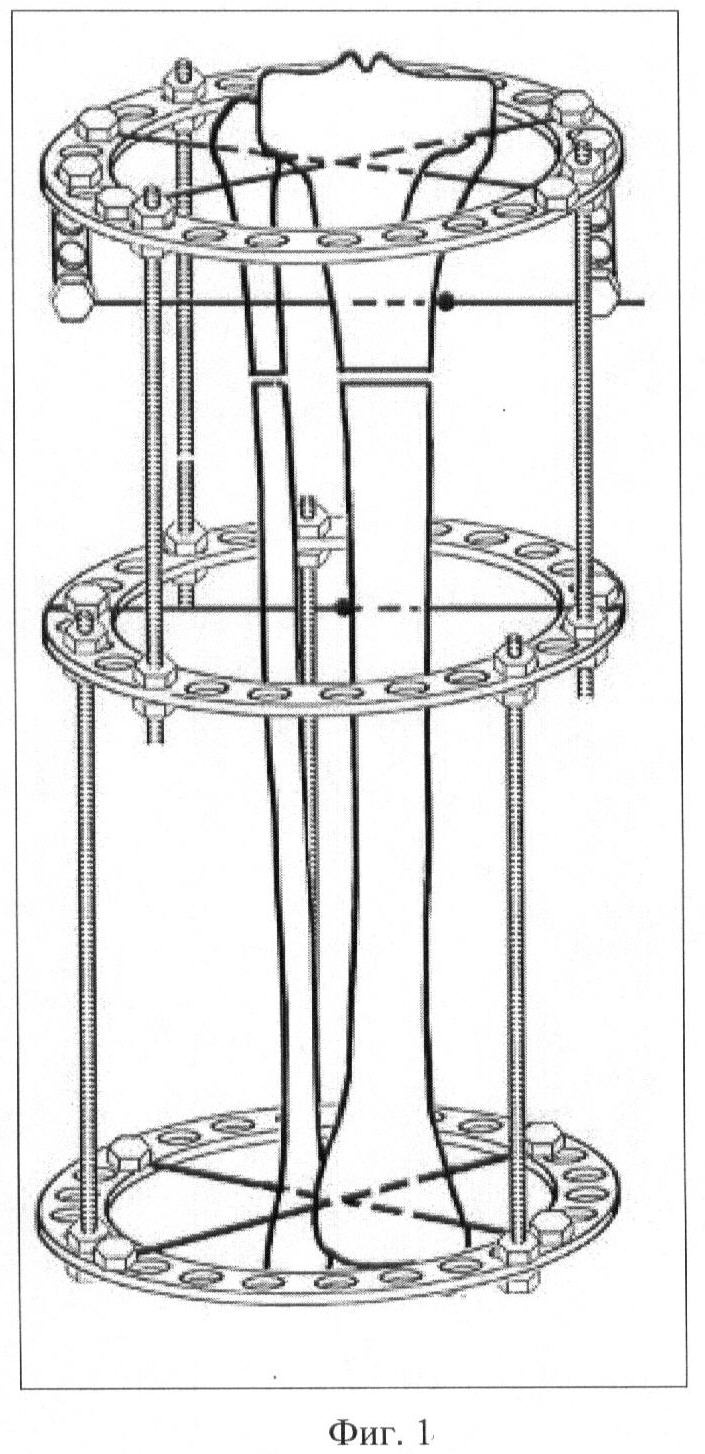 Известен способ чрескостного остеосинтеза диафизарных переломов костей голени по способу Г.А.Илизарова (фиг.1), согласно которому на уровне проксимального метаэпифиза большеберцовой кости проводят две базовые спицы под углом взаимного перекреста, близким к 60°. На уровне дистального метаэпифиза проводят вторую пару базовых спиц. Затем монтируют аппарат внешней фиксации на основе трех-четырех кольцевых опор (2 опоры – базовые, 1 или 2 – парафрактурные). Прилагают дистракцию и проводят две парафрактурные репозиционно-фиксационные спицы с упорными площадками. В качестве примера на фиг.1 представлена схема чрескостного остеосинтеза по Г.А.Илизарову при переломе костей голени в верхней трети [Шевцов, В.И. Аппарат Илизарова. Биомеханика / В.И.Шевцов, В.А.Немков, Л.В.Скляр. – Курган: Периодика, 1995. – 165 с.].