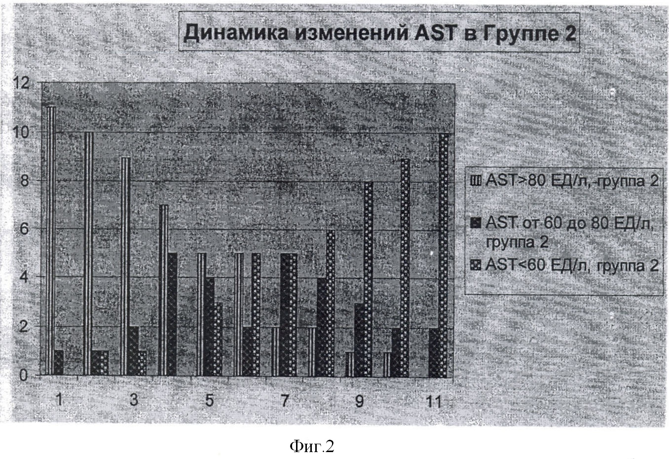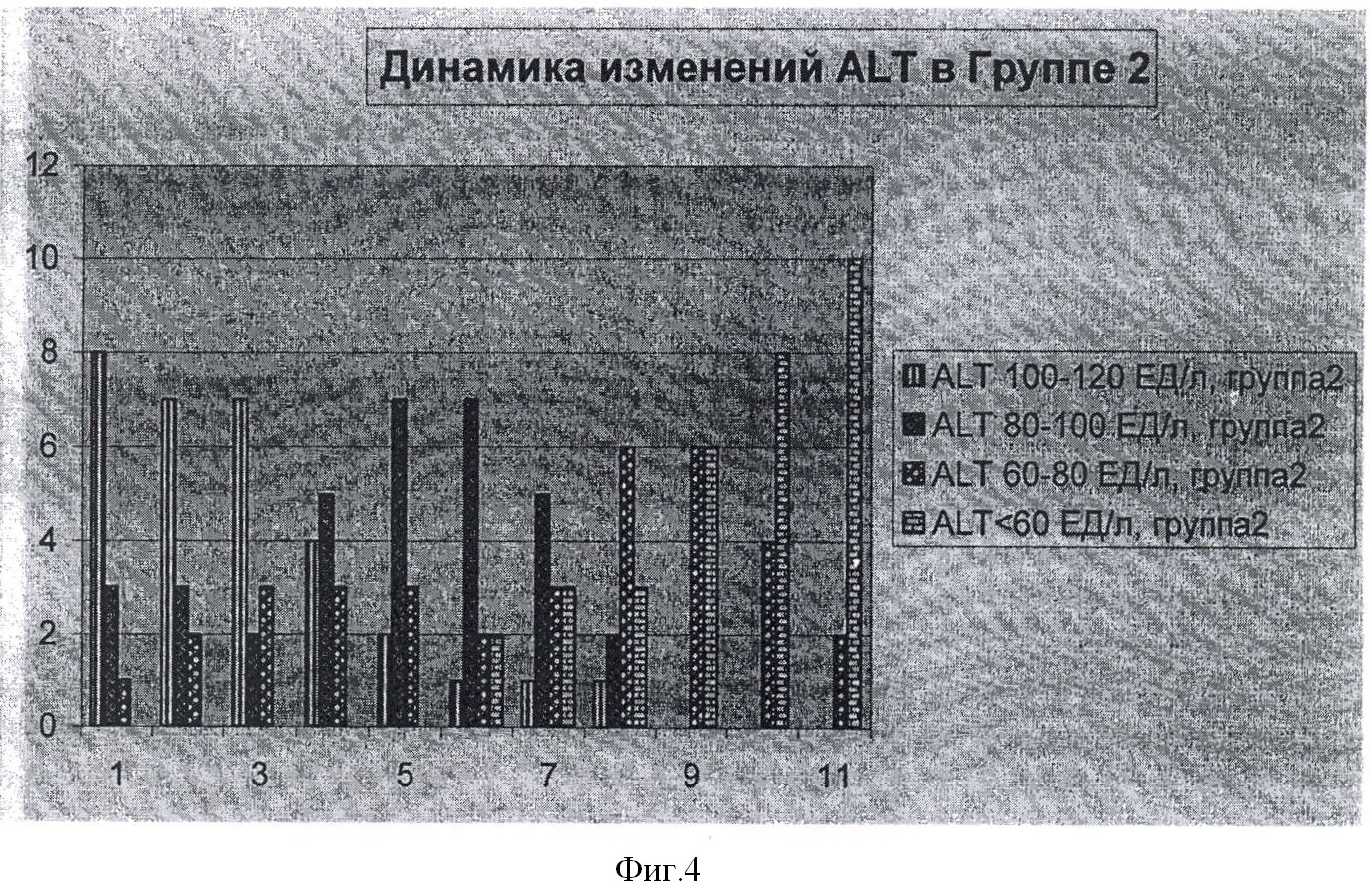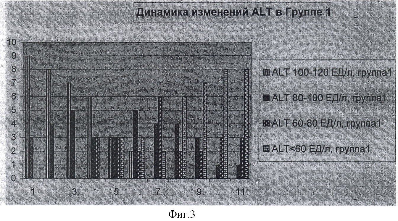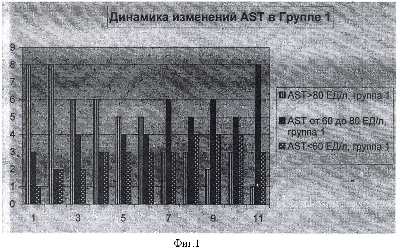 Каждые 2 недели проводился биохимический анализ крови каждого из 24 пациентов, включающий определение ферментов печени (аспартатаминотрансферазы, AST, аланинаминотрансферазы, ALT). Динамика изменений каждого из указанных биохимических показателей в обеих группах по неделям отражена в таблице и на фиг.1-4 (по оси абсцисс – неделя исследования, по оси ординат – количество больных с данным значением биохимического показателя).