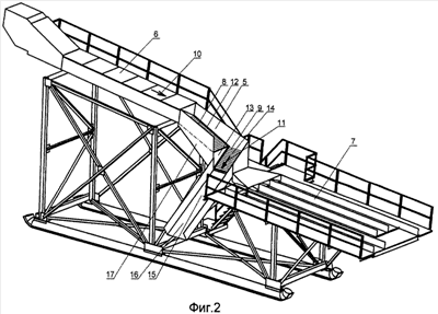 Из россыпи пески подаются бульдозером на гидровашгерд 2 и размываются гидромонитором 1. Надрешетные фракции сбрасываются струей гидромонитора 1 в отвал, а более мелкие фракции проходят через отверстия решета гидровашгерда 2 и подаются в виде гидросмеси гидроэлеватором 3 по напорному пульповоду 4 на шлюз глубокого наполнения 6. Со шлюза глубокого наполнения 6 пульпа поступает на первую часть 8 гидрогрохота 5, установленную по ходу 10 поступления пульпы из шлюза глубокого наполнения 6. Посредством решетки 12 осуществляется фракционное разделение и поступление надрешетного материала на решетку 14 второй части 9 гидрогрохота 5, которая сочленяется посредством переходной стенки 13 с решеткой 12 первой части 8 гидрогрохота 5 и установлена поперек 11 направления поступления материала из первой части 8 гидрогрохота 5. Ступенчатый перепад уровней первой части 8 и второй части 9 гидрогрохота 5 создает дополнительное гидродинамическое воздействие на разделяемый материал, способствуя дополнительному разрушению твердой составляющей пульпы и последующему фракционному их разделению. Надрешетный материал поступает по концевой части 16 направляющего желоба 15 в отвал. Подрешетный материал гидрогрохота 5 поступает через подрешетный отсек 17 на шлюзы мелкого наполнения 7.