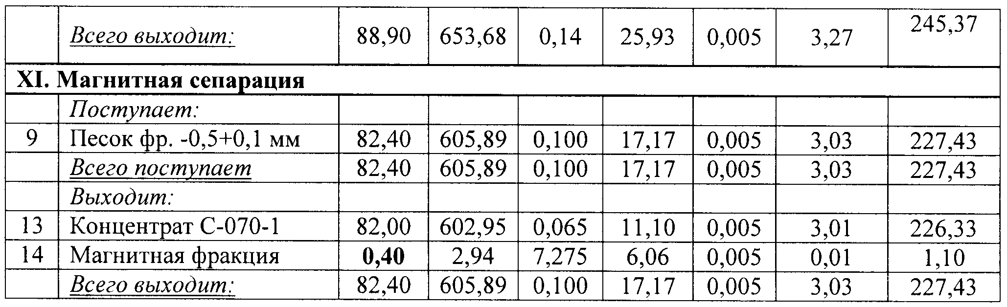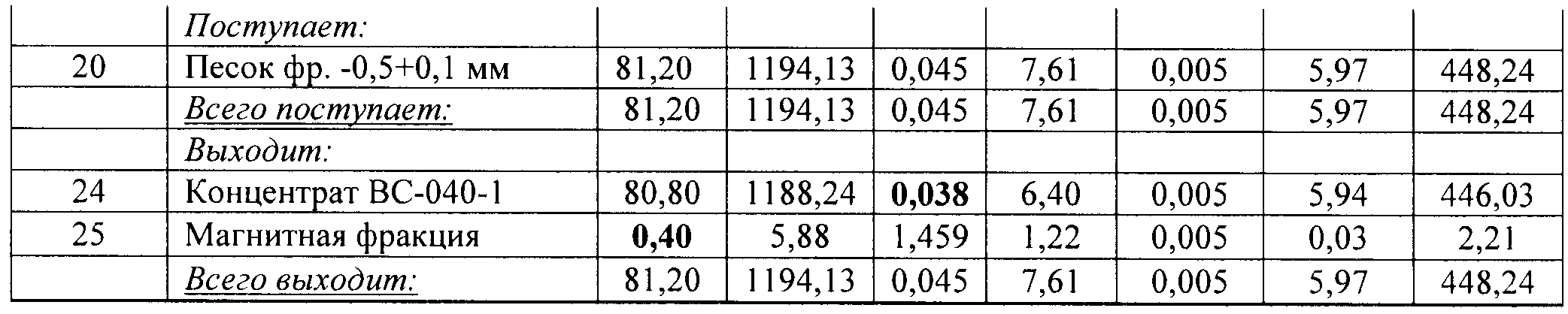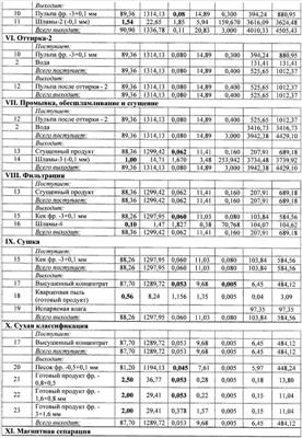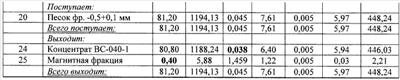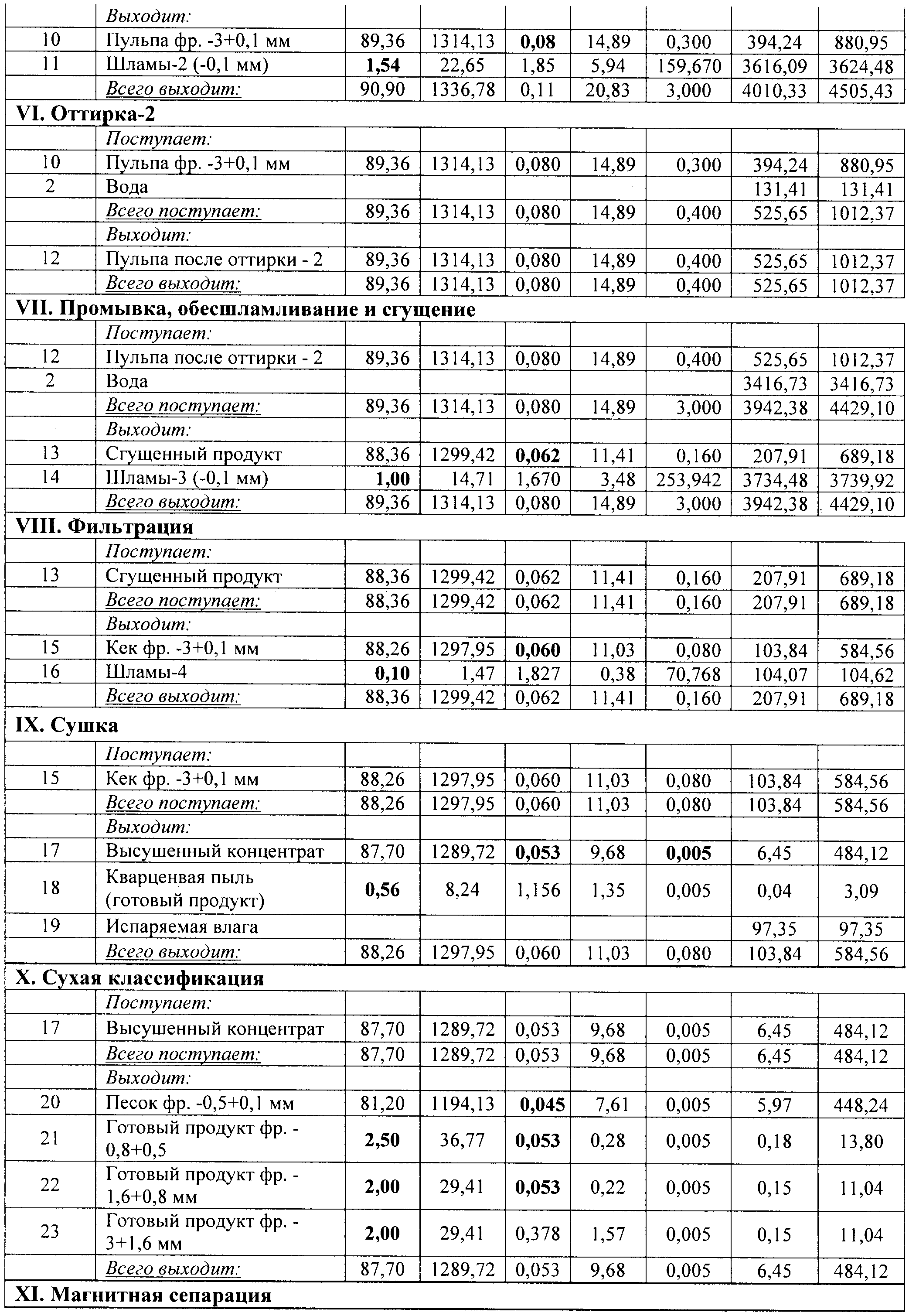 В таблице 5 приведен баланс продуктов обогащения кварцевого песка в режиме мокрого обогащения на 2-х линиях.