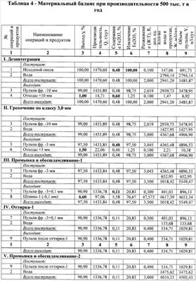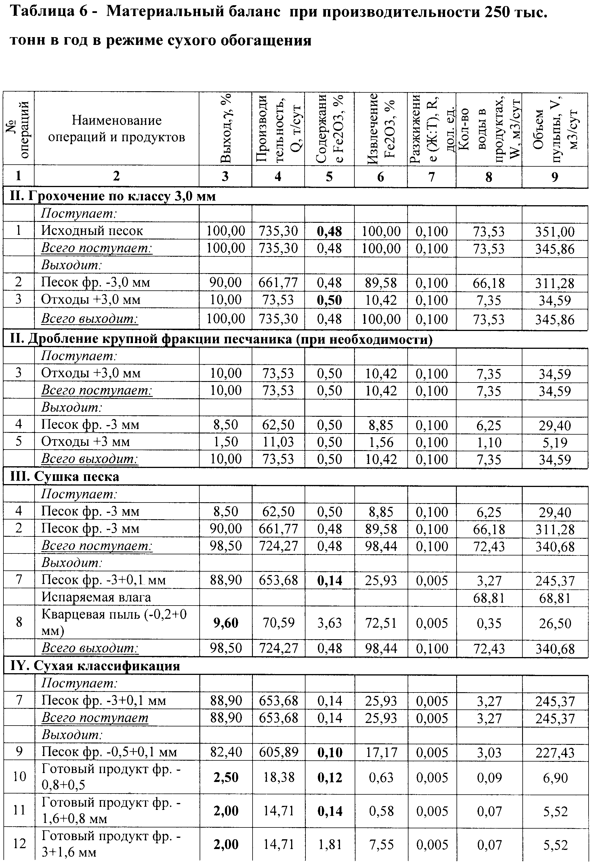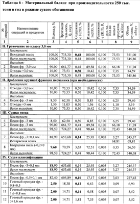 В таблице 7 приведен баланс продуктов кварцевого песка в режиме сухого обогащения