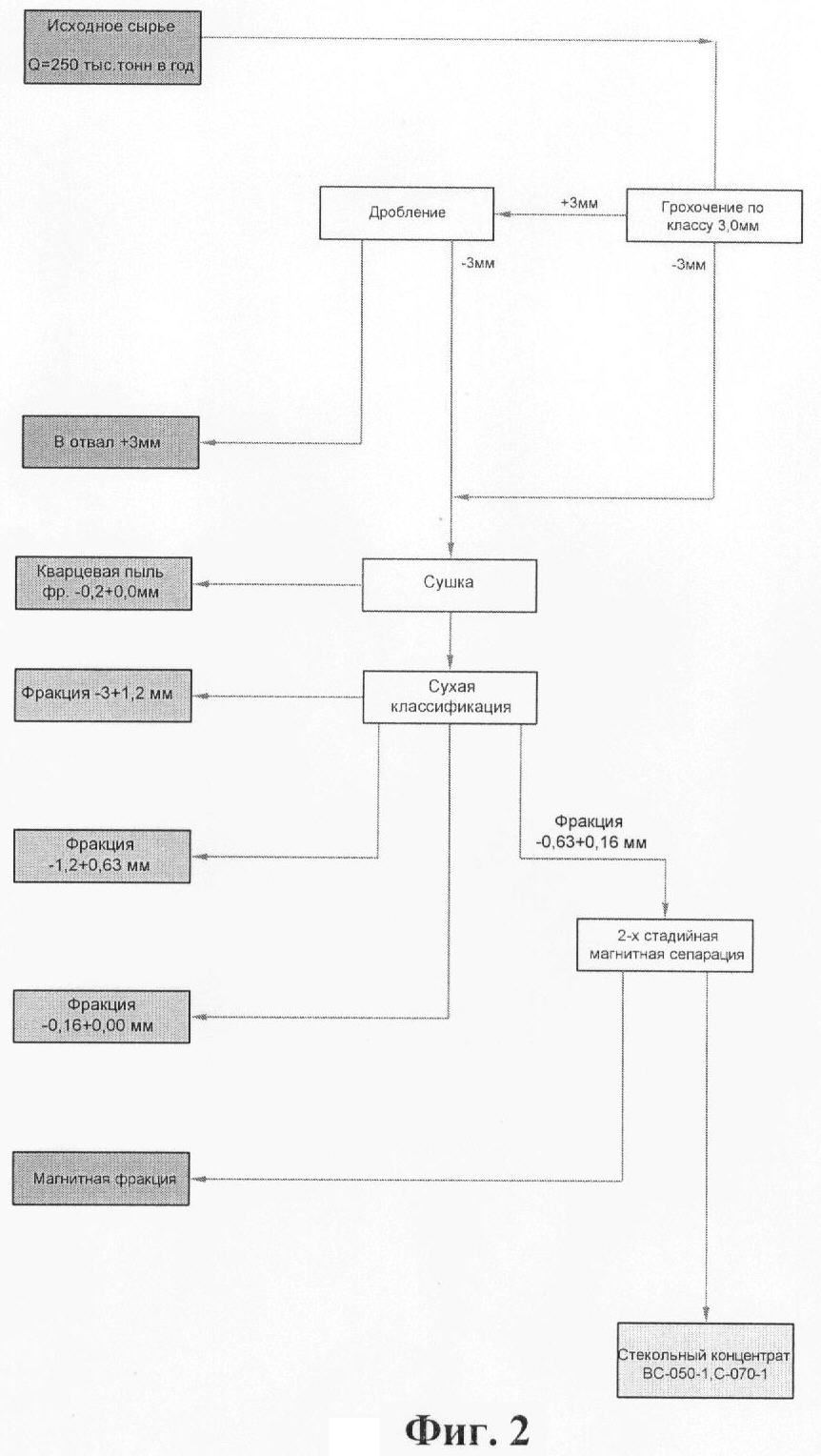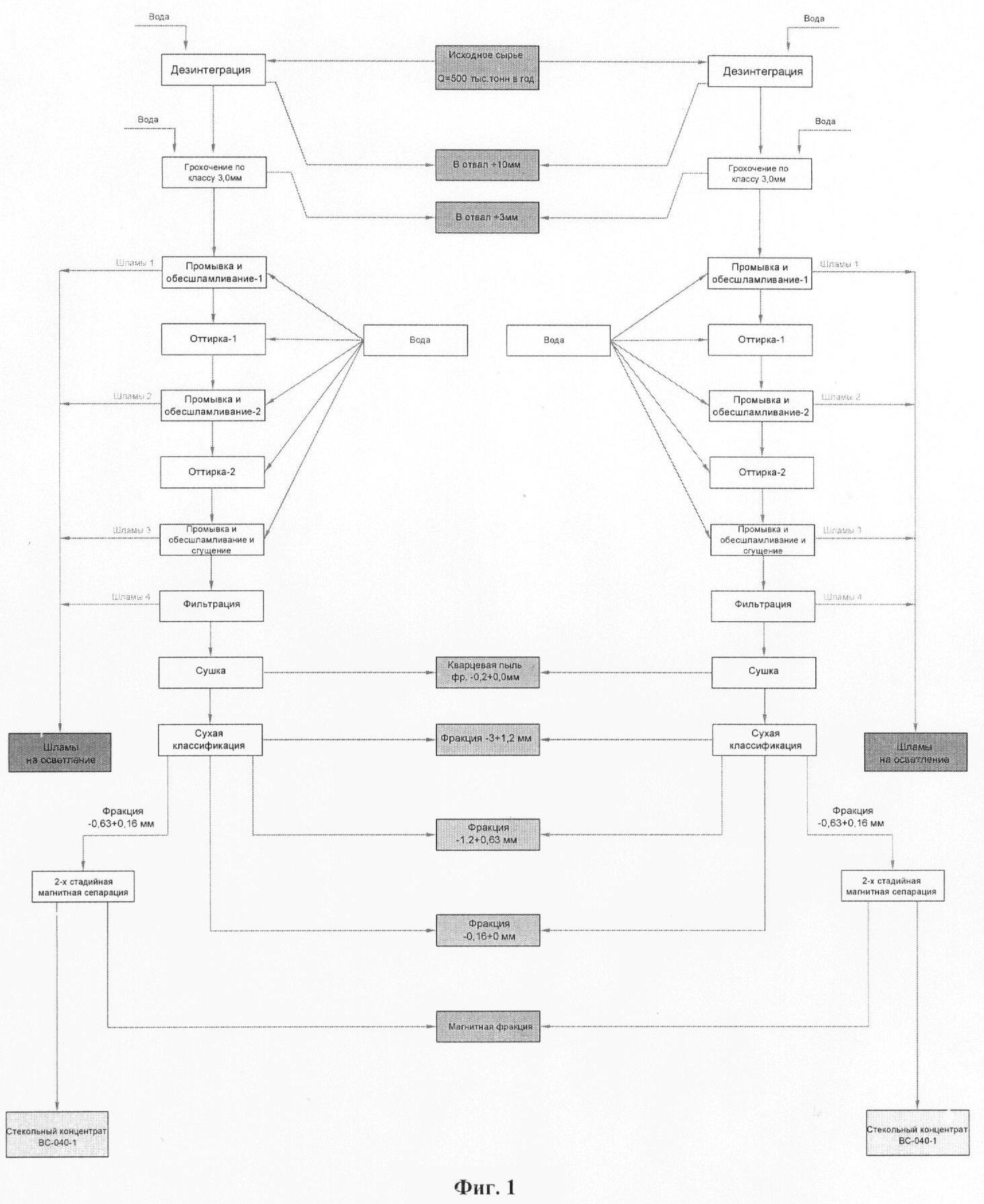 Способ обогащения кварцевых песков для получения стекольного концентрата, осуществляемый на двух технологических линиях, одна из которых может работать по схеме сухого обогащения, для этого из приемного бункера сырье с помощью конвейера подают на сухое грохочение для разделения по классу 3,0 мм, надрешетный продукт крупностью +3,0 мм подают на измельчение в валковую дробилку, измельченный продукт объединяют с подрешетным продуктом крупности -3,0 мм грохота и совместный продукт посредством 2-х последовательных конвейеров подают в сушилку, а при мокрой схеме вначале из приемного бункера ленточным конвейером сырье подают в скруббер-бутару на дезинтеграцию и грохочение по классу крупности 10 мм для отделения частиц крупнее 10 мм и получения пульпы, подаваемой на мокрую классификацию на грохот для разделения по классу крупности 3,0 мм, фракцию +3,0 мм объединяют с надрешетным продуктом, полученным после бутары, и направляют в отвал, подрешетный продукт грохота – фракцию -3,0 +0 мм подают в первый контактный чан с переливом шламов для интенсивной промывки обрабатываемого материала от илистой и глинистой составляющей за счет дополнительной подачи воды и активного перемешивания, затем пульпу подают в гидроциклон для отделения шламов и сгущения пульпы, из гидроциклона сгущенную пульпу подают в двухкамерную оттирочную машину для первой стадии оттирки оксидной пленки с поверхности зерен песка, из оттирочной машины пульпу подают во второй контактный чан, для второй стадии интенсивной промывки обрабатываемого материала от вскрытой пленки и глинистой составляющей за счет подачи дополнительной воды и активного перемешивания, далее пульпу подают в гидроциклон, где происходит дополнительное отделение шламов и пленки, образовавшихся после оттирки, и сгущение пульпы, из гидроциклона пульпу подают в двухкамерную оттирочную машину на вторую стадию оттирки, после которой пульпу подают в третий контактный чан для третьей стадии интенсивной промывки обрабатываемого материала за счет дополнительно подаваемой промышленной воды и активного перемешивания, далее полученную пульпу подают в спиральный классификатор, где продукт промывают за счет дополнительно подаваемой промышленной воды, и обесшламливают по зерну 0,1 мм и сгущают до состояния кека с влажностью 16-18%, сгущенный кварцевый продукт, подают на фильтрацию, на ленточный вакуум-фильтр для удаления воды и получения кварцевого кека влажностью 6-8%, после ленточного фильтра кварцевый кек для удаления влаги до 0,5% подают в сушилку, высушенный кварцевый продукт, полученный по мокрой и сухой схемам подвергают классификации на трехдечном грохоте с получением песков фракций: -3,0 +1,2 мм; -1,2 +0,63 мм и -0,16 +0 мм, направляемых на склад готовой продукции, и фракции -0,63 +0,16 мм, направляемой на 1-ю стадию магнитной сепарации при напряженности магнитного поля от 0,45 Тл, где отделяют сильномагнитные частицы обрабатываемого материала, которые направляют в отвал, затем осуществляют вторую стадию магнитной сепарации на трехступенчатом роликовом магнитном сепараторе, который предназначен для удаления сухих слабомагнитных материалов при напряженности магнитного поля на поверхности роликов в 1,8-1,9 Тл, немагнитная фракция является стекольным концентратом, который с помощью системы транспортных средств подаю