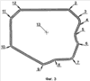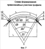 Способ получения опалубочного профиля заключается в том, что из исходной круглой трубы 1 диаметрами D×d 2 формообразуют профиль заданного вида. В начальных клетях осуществляется первоначальная организация граничных переходных радиусных зон 2, 3, 4, 5, 6, 7, 8, 9, 10, 11 и 12, которая осуществляется относительно центра жесткости 13, совпадающего с осью проката. Последующее формирование прямолинейных участков 14, 15, 16, 17, 18, 19, 20, 21, 22, 23 и 24 опалубочного профиля ведется при условии сохранения постоянными длин дуг 25, 26 формообразующих прямолинейные участки 27 поверхностей профиля и равными длинам L соответствующих прямолинейных участков 27 готового профиля (показано на примере одного из таких участков), т.е. граничные переходные радиусные зоны 2, 3, 4, 5, 6, 7, 8, 9, 10, 11 и 12 сохраняют свою геометрическую ориентацию по периметру профиля, увеличением радиусов кривизны 28 и 29 валков таким образом, чтобы при переходах от одной клети к другой углы подгиба (разность углов 30 и 31) были равными 15-20 градусам.