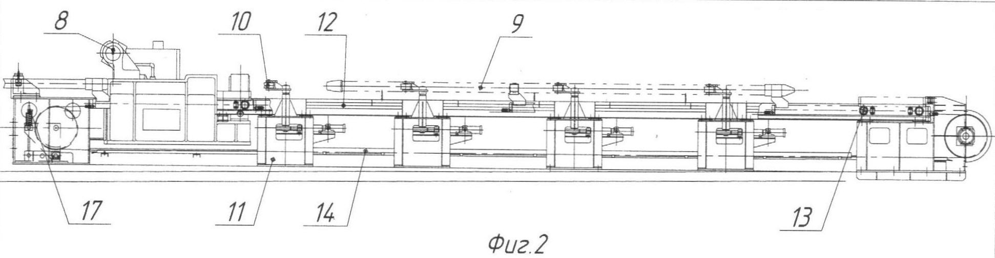 При прокатке справочный стержень 9 удерживается на оси центрователями 2 и упорно-регулировочным механизмом 8. После окончания прокатки упорно-регулировочный механизм раскрывается, гильза тянущими роликами 3 перемещается до упора 7, одновременно с этим справочный стержень 9, удерживаемый в процессе движения роликами 10, тележкой 13 механизма перемещения стержня отводится за упорно-регулировочный механизм 8 в зону замены стержня. Гильза, свободная от стержня 9, остается перед упором 7 и выбрасывателем 4 передается на приемную решетку 5 боковой передачи. Задержник 6 обеспечивает накопление гильз на решетке при необходимости.