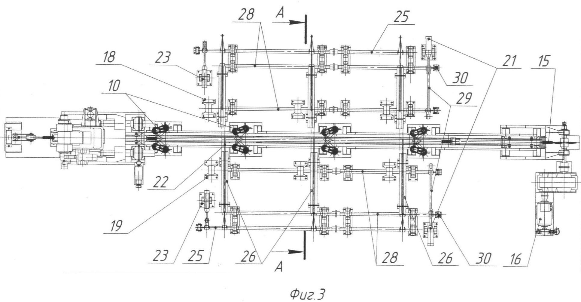 В исходном положении механизма перемещения стержня транспортные тележки отведены от оси прокатки, подъемно-опускающиеся столы 20 с направляющими 26 транспортных тележек 22 находятся в нижнем положении, оси V-образных захватов тележек совмещены с осями желобов 18 и 19.