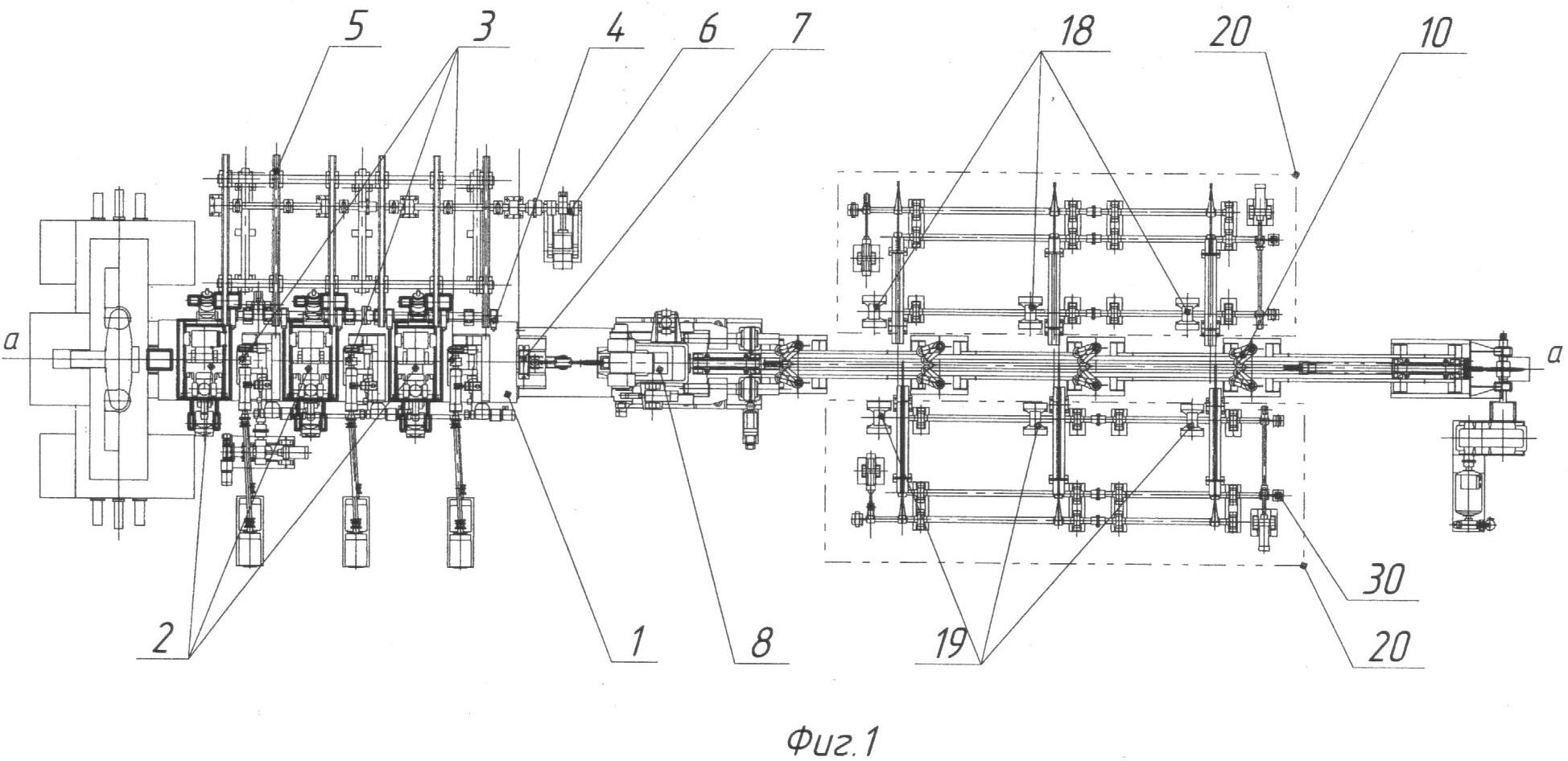 Замена стержня 9 осуществляется при совместной работе роликов 10, механизма смены стержня и размещенных на стойках желобов 18,19. Механизм смены стержня разделен осью прокатки а-а на два симметричных подъемно-опускающихся стола 20, при совместной работе которых стол со стороны свободного желоба 19 убирает стержень с оси прокатки, а стол со стороны желоба 18 со сменным стержнем устанавливает сменный стержень на ось прокатки а-а.