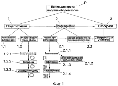 На фиг.1 схематически представлена последовательность выполнения операций на производственной линии P для изготовления обода колеса. На подготовительном участке 1 линии на первой стадии 1.1 отрезают металлические полосы требуемой длины, а на второй группе стадий 1.2 из них формируют цилиндрическое основание. При этом полосу последовательно сворачивают (1.2.1) и ее передние края сваривают между собой (1.2.2), после чего сварной шов шлифуют (1.2.3).