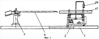 На раме 1 стенда для автоматической сварки в среде защитных газов размещены самоходная тележка 2 и устройство перемещения 3 сварочной консоли 4, на подвижном основании 5 которого установлены механизм горизонтального перемещения 6 и колонна 7. В колонне 7 размещена стойка 8 с платформой 9 и приводом 10 вертикального перемещения платформы 9. На платформе 9 установлен механизм колебания 11 сварочной горелки 12. Механизм колебания 11 жестко связан с направляющей трубкой 13, которая расположена на опорах внутри консоли 4. Через направляющую трубку 13 к закрепленной на ее конце горелке 12 подведены системы подвода к горелке сварочного тока, защитного газа, сварочной проволоки и охлаждающей жидкости. На платформе 9 закреплен механизм подачи сварочной проволоки 14 и жестко связанный с консолью 4 механизм корректировки 15, посредством которого осуществляется настройка положения консоли 4 в вертикальной плоскости для компенсации естественного прогиба консоли. Самоходная тележка 2 снабжена приводом перемещения 16, имеющим два режима скоростей – настроечный и режим сварки. На раме тележки 2 для закрепления изделия, например камеры АВО 17, размещены связанные между собой и с приводом 18 механизма поворота опоры 19, 20. При этом опора 20 установлена с возможностью вертикального и горизонтального перемещения от механизмов 21, 22 соответственно для осуществления при необходимости настроечных перемещений изделия 17 относительно горелки 12. На раме тележки 2 установлен поворотный кронштейн 23 с пультом 24 управления всеми механизмами установки.