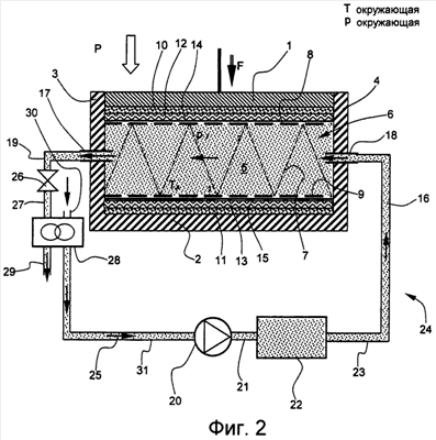 В первой и второй боковых стенках 3, 4, как и в первом варианте, предусматриваются впуски и выпуски 17, 18 для пропускания нагретого воздуха 16 через многослойную деталь 6. Снаружи вулканизатор имеет нормальную окружающую температуру ТОкружающая, например, 21°С, и окружающее давление воздуха рОкружаюшее, например, 1013 гПа. Прижимной поршень 1 посредством гидравлической системы (подробно не показана) с усилием F давит на многослойную деталь 6 и, следовательно, на опорную подушку 2 с целью создания требуемого рабочего давления рРабочее на наружной поверхности многослойной детали 6.