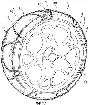фиг. 1 – вид в перспективе, иллюстрирующий цепь противоскольжения согласно изобретению, наложенную на шину колеса, показанного со стороны, обращенной внутрь транспортного средства;