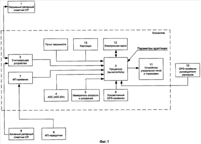 Передаваемая на локомотив информация от ОР о длине маршрута до препятствия, приведенном профиле тормозного пути, допускаемой скорости воспринимается считывающими устройствами 2 и обрабатывается в аппаратно-программном локомотивном устройстве (процессоре) 3. Процессор осуществляет расчет допустимой траектории движения V(S) и в случае превышения значения фактической скорости над допустимой выдает в локомотивное устройство управления тягой и торможением 11 команды на разбор тяги и применение служебного, а в необходимых случаях и экстренного торможения. При этом в расчете учитываются поступающие из блоков 4, 5 и пульта машиниста следующие данные: