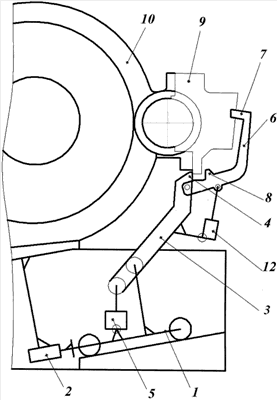 Затем поднимают рычажный механизм гидроцилиндром 5 в исходное положение с упором заплечика 4 в разъем фланца крышки 9 и фиксацией ее фиксатором 7 на рычаге 6. Далее включают в работу силовой привод 2, например электроприводной винтовой привод, и продвигают каретку 1 в направлении съема крышки 9, усилием винта сдвигают ее с посадочного места, а затем за счет заданной кинематики рычагов 3, 6 и усилия гидроцилиндров 5, 12 опускают вниз. При этом крышка 9 ложится на упор 8.
