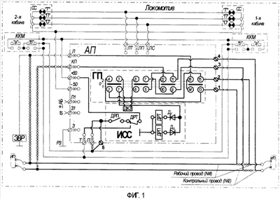 Контактные пары группового переключателя ГП – 1-2, 5-6, 3-4, 7-8 и 9-10, 11-12 обеспечивают подключение выполняющей функции дубликатора концевой заделки ДКЗ перемычки (между 1 и 6 контактами) к дополнительным клеммам 3 и 1 либо 4 и 2. При использовании БУ/БП-ЭПТМ в качестве блока управления вместо перемычки устанавливается дубликатор диод концевой заделки ДДКЗ (на фиг.1 не показан) в проводящем направлении от контакта 6 к контакту 1. В результате автоматически осуществляется сообщение контрольного провода 2 с рабочим проводом 1 от клеммной коробки соответственно со стороны 1-й или 2-й кабин. Две переключающие контактные пары группового переключателя ГП (не показанные на фиг.1) обеспечивают отключение плюсового и минусового проводов соответственно к контроллеру крана машиниста ККМ и лампам светового сигнализатора СС нерабочей кабины. Одновременным имеет место подключение указанных проводов соответственно к контроллеру крана машиниста ККМ и лампам светового сигнализатора СС рабочей кабины.