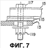 Обратимся теперь к рассмотрению фиг.6 и 7, на которых показано частичное поперечное сечение тележки 10 железнодорожного вагона. Показано основное поперечное сечение боковин 12 и 14, причем опора 13 на боковине для опорной балки идет от верхней секции боковины 12, а другая аналогичная опора на боковине для опорной балки идет от верхней секции боковины 14. Опорная балка 15 из конструкционной стали идет в боковом направлении между боковыми опорами на боковинах для опорной балки. Можно видеть, что опорная балка 15 содержит концевую секцию, имеющую отверстие для ввода болта (болта крепления) 117 опорной балки. Болт 117 опорной балки пропущен через дополняющее отверстие в опоре 13 на боковине для опорной балки. Соответствующую стопорная гайку или другую аналогичную крепежную деталь 119 навинчивают на болт 117 опорной балки.