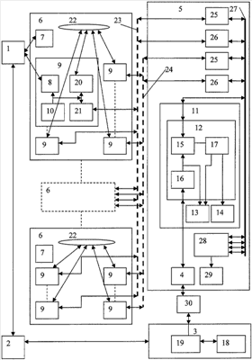 При движении состава на перегоне с необходимой периодичностью обеспечиваются контроль и передача на локомотив 5 всех параметров, измеряемых блоками 10 измерительных датчиков физических характеристик буксовых узлов 9 и датчиками 22 физических характеристик, размещенными вне буксовых узлов 9. Информация от распределенных датчиков 22 физических характеристик подвижных единиц 6 и локомотива 5 поступает во вторые модули 20 приемопередатчиков локальных сетей маломощной радиосвязи. Локальные сети маломощной радиосвязи работают в ISM (Industrial, Scientific, Medical) диапазонах рабочих частот, не требующих лицензии. Один из этих модулей, на каждой подвижной единице 6 является мастером локальной сети данной подвижной единицы 6. Вся полученная информация поступает через соединение между портами в первый модуль 21 приемопередатчика и передается на локомотив 5. Во вторые модули 20 приемопередатчиков поступает информация от соответствующих блоков 10 датчиков физических характеристик буксовых узлов 9. Все датчики, измеряющие критические параметры, требующие экстренной остановки поезда при превышении заданных норм, дублированы. Информация через локальные сети маломощной радиосвязи 23 и 24 ISM диапазона соответственно левой и правой сторон поезда передается соответствующим первым 25 или вторым 26 модулям приемопередатчиков, размещенным на локомотиве 5, в зависимости от того, кто из этих модулей выполняет в конкретные моменты времени функции мастера локальной сети. При этом другие модули приемопередатчиков 25, 26 получают эту же информацию от мастера для целей непрерывности тестирования правильности функционирования устройств в комплексном локомотивном устройстве 28 безопасности. Первые модули 21 приемопередатчиков буксовых узлов выполняют функции ретрансляции информации от других приемопередатчиков 21 буксовых узлов 9, расположенных дальше, по отношению к мастеру своей локальной сети. Мастера каждой из локальных сетей 23, 24 через CAN интерфейс 27 локомотива 5 передают информацию в систему 11 автоведения состава и в соответствующие дублированные центральные модули (на чертеже не показаны) обработки информации комплексного локомотивного устройства 28 безопасности, которое при выявлении опасных ситуаций в условиях движения поезда осуществляет экстренное торможение путем непосредственного воздействия на устройство 29 экстренного торможения поезда.