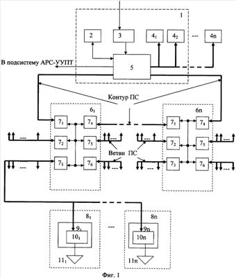 Вход ББП является входом питания поста 1 ГАЦ, выход ББП 3 соединен с входом ПРБ 5, отдельный вход-выход которого соединен с входом-выходом персональной ЭВМ 2, отдельный выход предназначен для передачи информации в подсистему автоматизированного регулирования скоростей скатывания отцепов и управления прицельным торможением (АРС-УУПТ), группа выходов ПРБ 5 соединена с входами с первого по n-й блоков БОИ 4, первая группа входов-выходов ПРБ 5 соединена с группой входов-выходов первой ПРК 61, а вторая группа входов-выходов ПРБ соединена с первой группой входов-выходов n-й ПРК 6n, первые группы входов-выходов всех ПРК 6 включены в контур ПС, остальные группы входов-выходов всех ПРК 6 включены в ветви ПС и соединены с группами входов-выходов с первого по n-й блоки БСО 8, выход ПД 11 соединен с входом НСУ 10 в своем БСО 8, первые входы-выходы НРС 7 являются первым, вторым, третьим, четвертым, пятым и шестым входами-выходами ПРК 6, а вторые входы-выходы первого и четвертого, второго и пятого, третьего и шестого НРС 7 в своей ПРК 6 объединены.