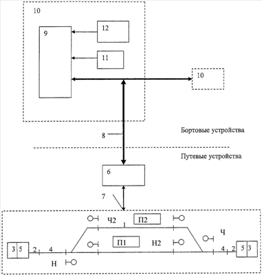 Диспетчерский центр 6 на основе подробной информации об обстановке на пути следования поездов формирует маршруты приема каждому поезду П1 и П2 и передает их в бортовое устройство 9 управления соответствующего локомотива 10. Полная информация, передаваемая в радиоканал 8 цифровой связи, формируется в диспетчерском центре 6 управления.